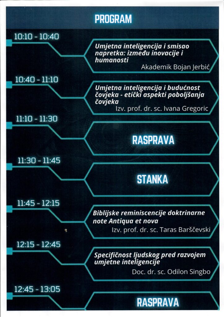 Katolički bogoslovni fakultet u Đakovu organizira interdisciplinarni znanstveni kolokvij „Umjetna inteligencija i granice čovještva“ u srijedu 26. studenoga s početkom u 10 sati. Povod raspravi je doktrinarna nota Antiqua et nova, koja poziva na kritičko promišljanje izazova umjetne inteligencije. Kolokvij želi otvoriti dijalog između teologije, filozofije, antropologije, etike i znanosti o pitanjima savjesti, identiteta i duhovnosti u digitalnom dobu.