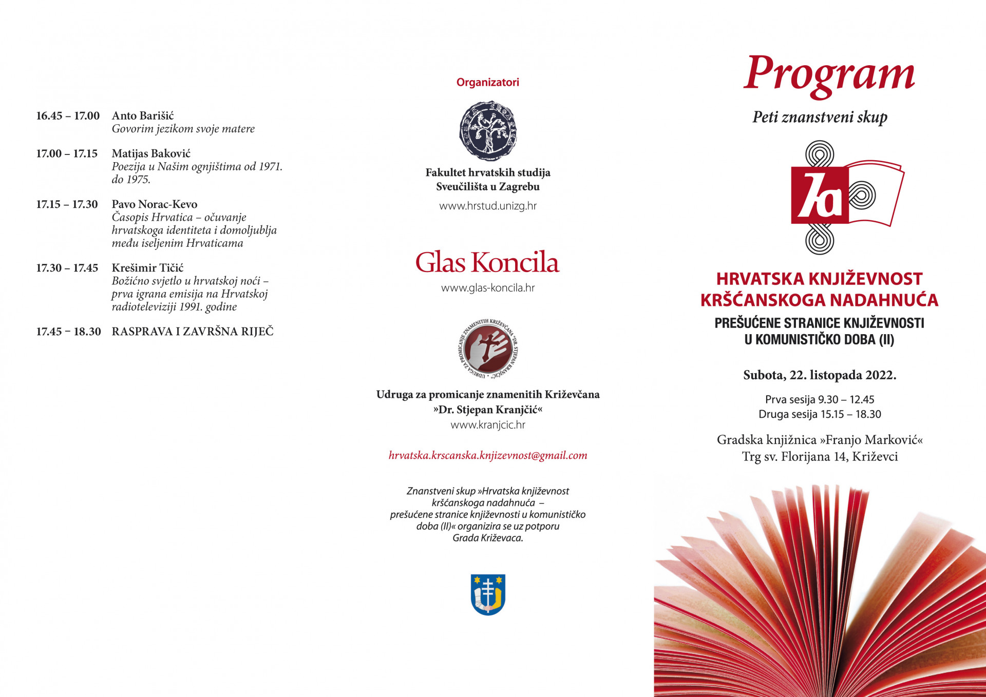 Peti znanstveni skup „Hrvatska književnost kršćanskoga nadahnuća – prešućene stranice književnosti u komunističko doba (II)“ bit će održan u subotu 22. listopada 2022. u Križevcima u organizaciji Fakulteta hrvatskih studija Sveučilišta u Zagrebu, Glasa Koncila i Udruge za promicanje znamenitih Križevčana „Dr. Stjepan Kranjčić“. Na znanstvenom skupu sudjelovat će dvadesetak znanstvenika iz cijele Hrvatske. Otvorenje će biti u 9 sati u Gradskoj knjižnici „Franjo Marković“, Trg sv. Florijana 14. Prva sesija započinje u 09.30, a druga u 15.15 sati.