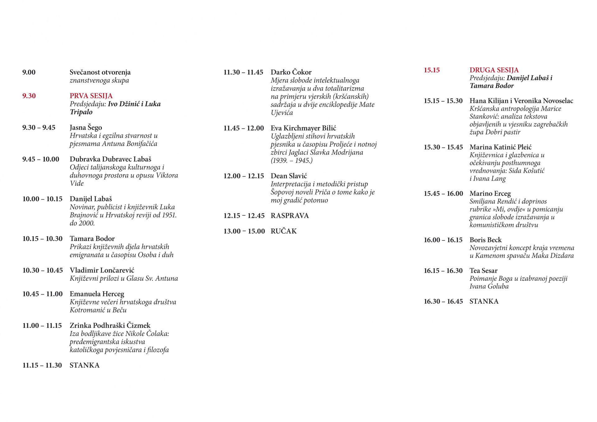 Skup će otvoriti Jasna Šego predavanjem Hrvatska i egzilna stvarnost u pjesmama Antuna Bonifačića. O drugom egzilnom pjesniku govorit će Dubravka Dubravec Labaš u predavanju Odjeci talijanskoga kulturnoga i duhovnoga prostora u opusu Viktora Vide, a niz o emigrantskim književnicima toga razdoblja nastavit će Danijel Labaš predavanjem Novinar, publicist i književnik Luka Brajnović u Hrvatskoj reviji od 1951. do 2000. O Brajnovićevom stvaralaštvu, ali u časopisu „Osoba i duh“ govorit će Tamara Bodor, dok će Vladimir Lončarević prikazati književno djelovanje emigrantskoga časopisa „Glas Svetoga Antuna“. Emanuela Herceg održat će predavanje o književnim večerima hrvatskoga društva „Kotromanić“ u Beču, a egzilnu tematiku nastavit će Zrinka Podhraški Čizmek predavanjem o emigrantu Nikoli Čolaku i njegovoj knjizi „Iza bodljikave žice“. U svom izlaganju Darko Čokor usporedit će dvije enciklopedije hrvatskoga leksikografa i katoličkoga intelektualca Mate Ujevića. Dio dosad neobjavljenih radova hrvatskoga glazbenika Slavka Modrijana (1909. – 1985.) prvi put će predstaviti Eva Kirchmayer Bilić, dok će Dean Slavić u svom izlaganju ponuditi novu interpretaciju novele Nikole Šopa iz 1938. godine „Priča o tome kako je moj gradić potonuo“.