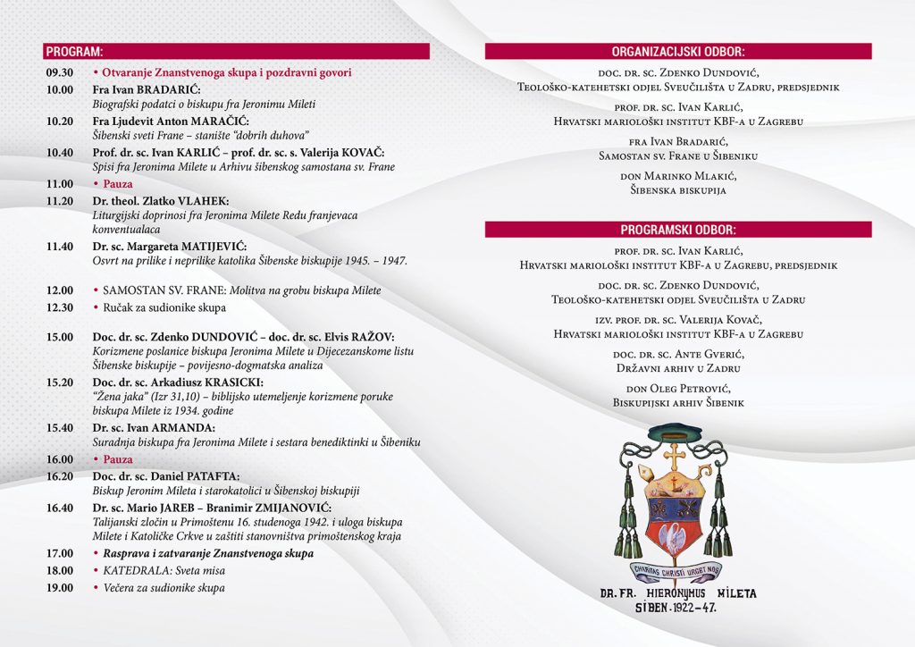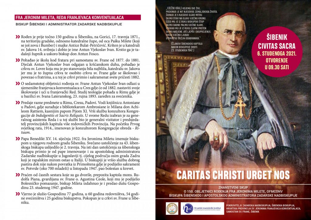 Znanstveni skup o 150. obljetnici rođenja šibenskog biskupa i zadarskog apostolskog upravitelja fra Jeronima Milete, OFM Conv., bit će održan u subotu 6. studenoga 2021. u prezentacijskom centru šibenske katedrale Civitas sacra u Šibeniku.