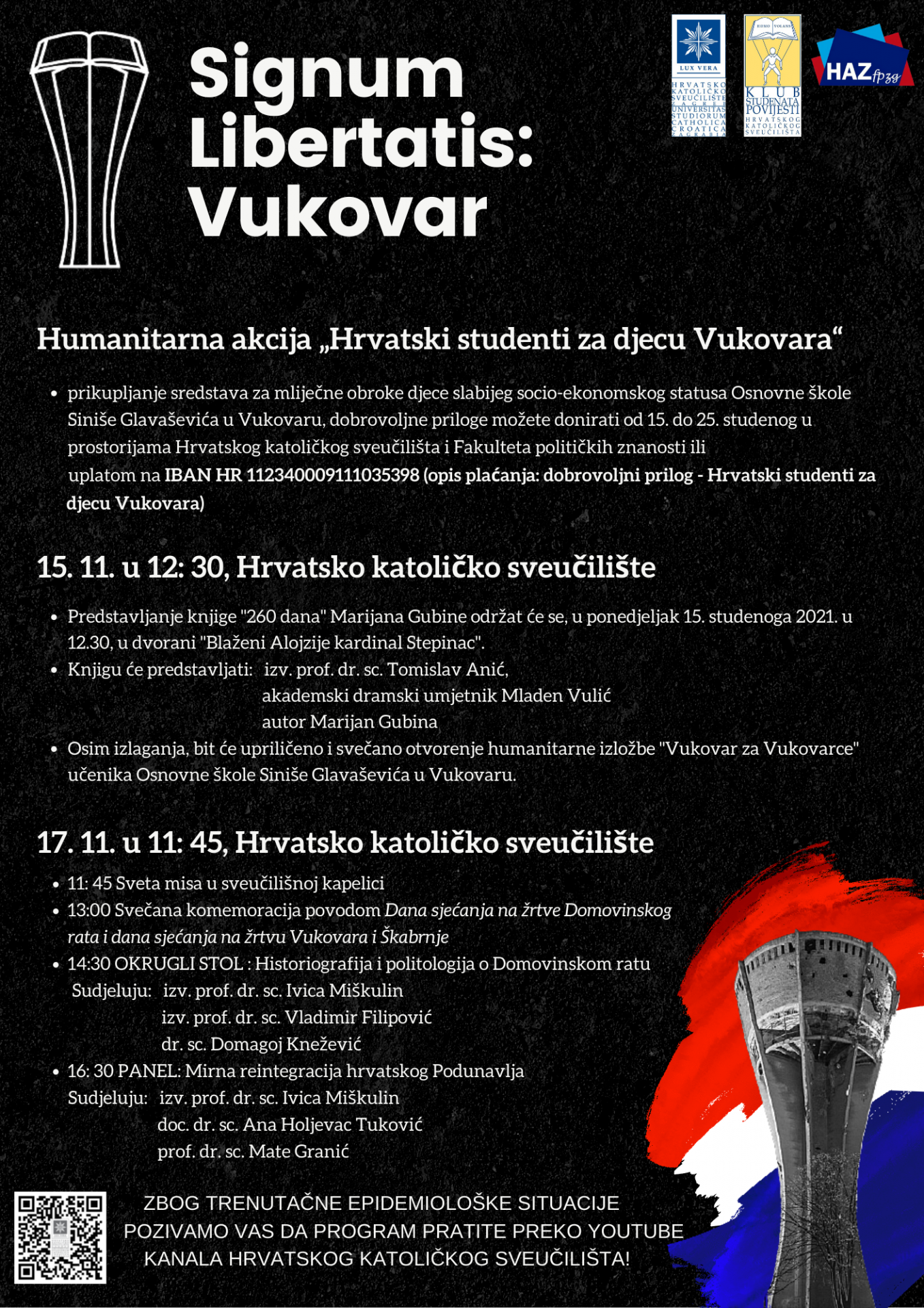 ZAGREB (IKA) – Klub studenata povijesti Hrvatskog katoličkog sveučilišta „Homo volans“ i ogranak Hrvatske akademske zajednice Fakulteta političkih znanosti Sveučilišta u Zagrebu organiziraju u ponedjeljak 15. studenoga i u srijedu 17. studenoga na Hrvatskom katoličkom sveučilištu (HKS) znanstveno-humanitarnu i komemorativnu manifestaciju „Signum Libertatis: Vukovar“.