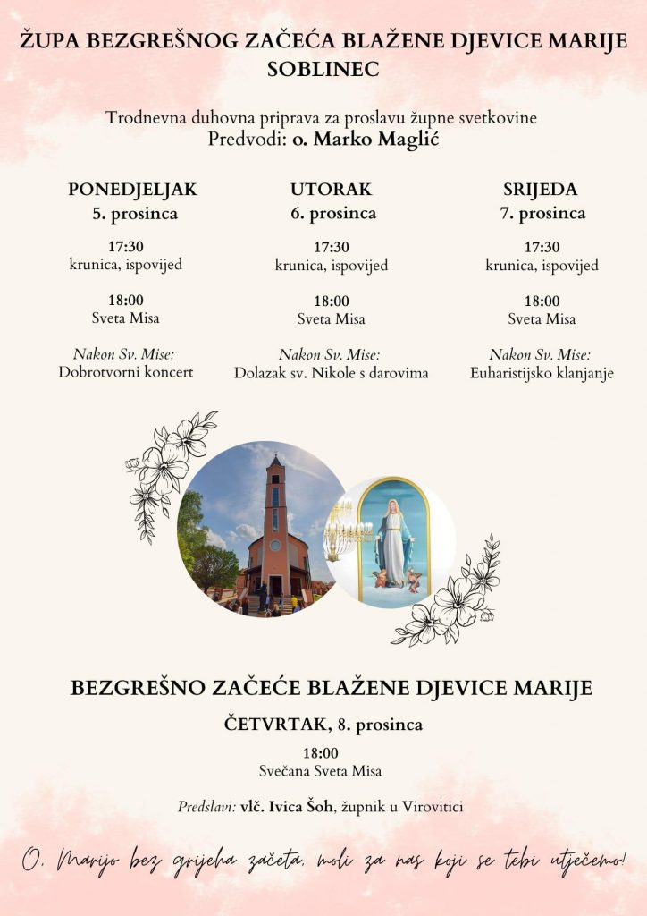 Župa Bezgrešnog začeća Blažene Djevice Marije u zagrebačkom Soblincu proslavit će u četvrtak 8. prosinca župnu svetkovinu.