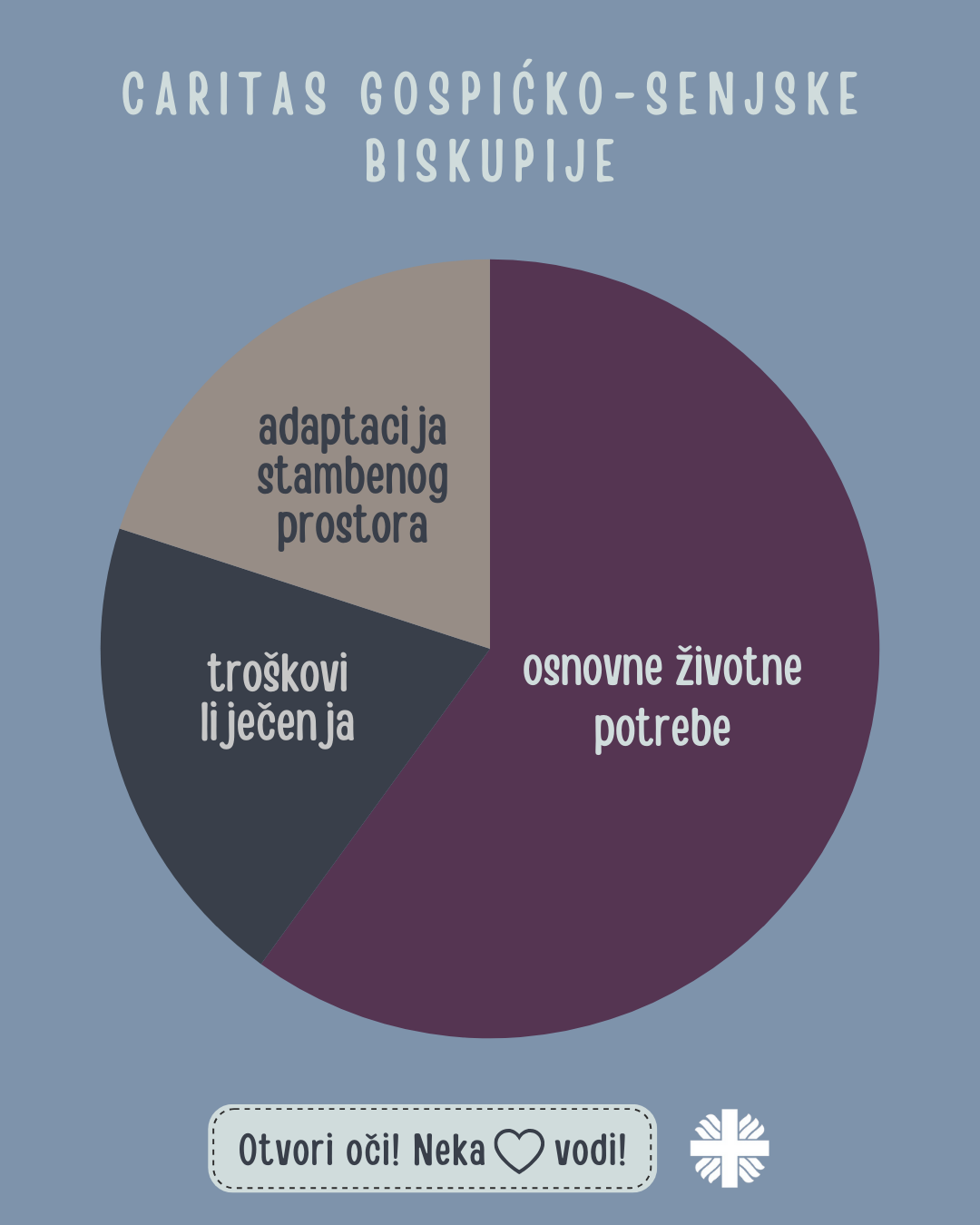 U Gospićko-senjskoj biskupiji pružena pomoć usmjerena je uglavnom za potporu jednoroditeljskim obiteljima, obiteljima čiji se članovi nose s teškim bolestima te obiteljima i pojedincima s malim primanjima kako bi lakše podnijeli svakodnevne troškove poput režija, nabave hrane i higijenskih potrepština te troškove liječenja. Caritas Gospićko-senjske biskupije pružio je pomoć ukupno 15 obitelji, odnosno, 43 korisnika.