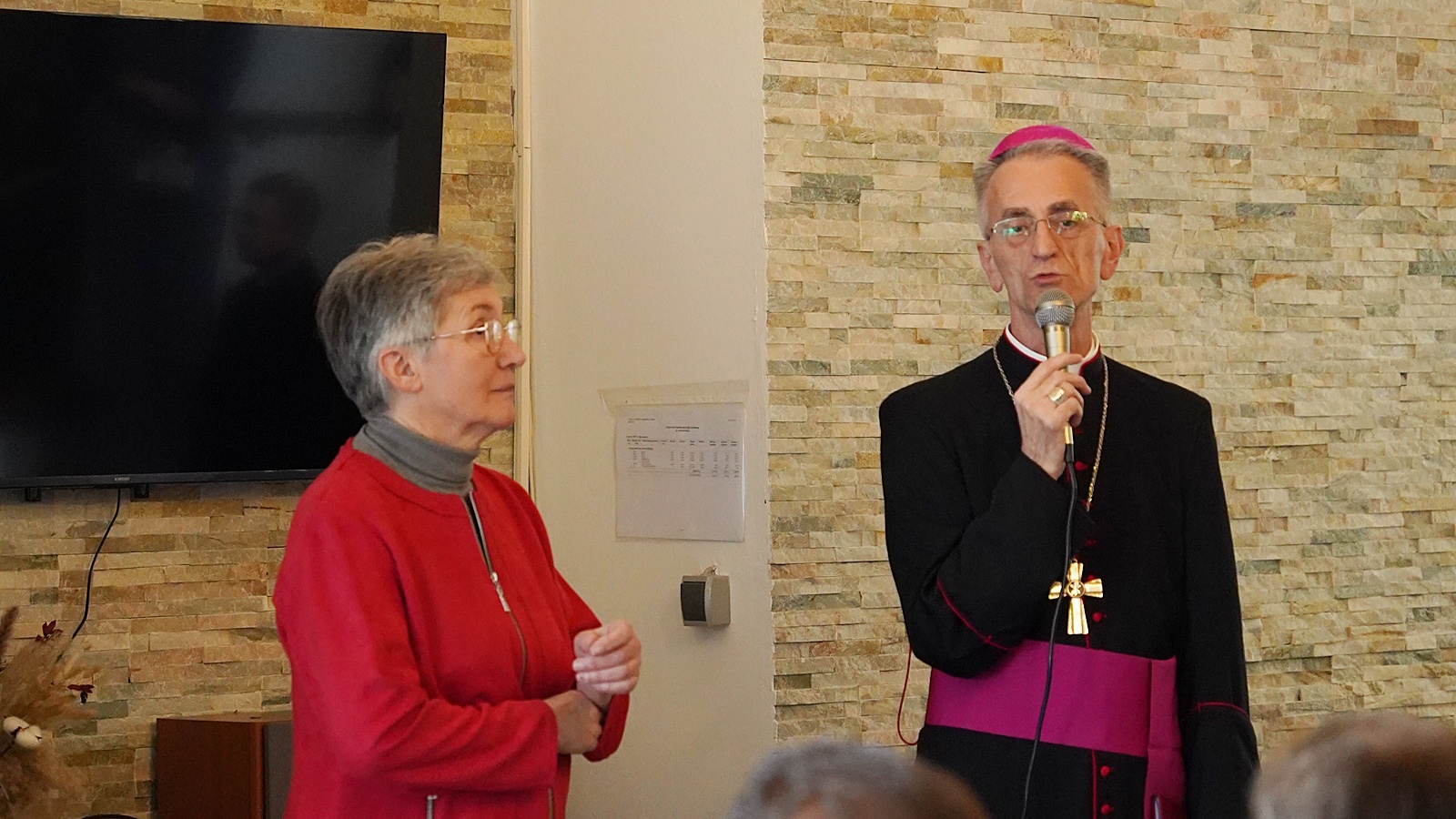 Na početku posjeta okupljenima se  obratila ravnateljica Doma izv. prof. dr. sc. Štefica Mikšić koja je izrazila radost dolaska biskupa i svih onih koji su bili u pratnji. Potom je biskup Ćurić u riječima čestitke izrekao poticajne i ohrabrujuće misli o stvarnosti života i stalnog poziva na usmjerenost prema Gospodinu od kojega dolazi i život i smrt, nada i radost. Recitirajući riječi dviju pjesama različitih autora, jednog hrvatskog svećenika i talijanskog nadbiskupa, podsjetio je na važnu ulogu staračke mudrosti i životne usmjerenosti prema Gospodinu i Njegovu otajstvu spasenja i otkupljenja.