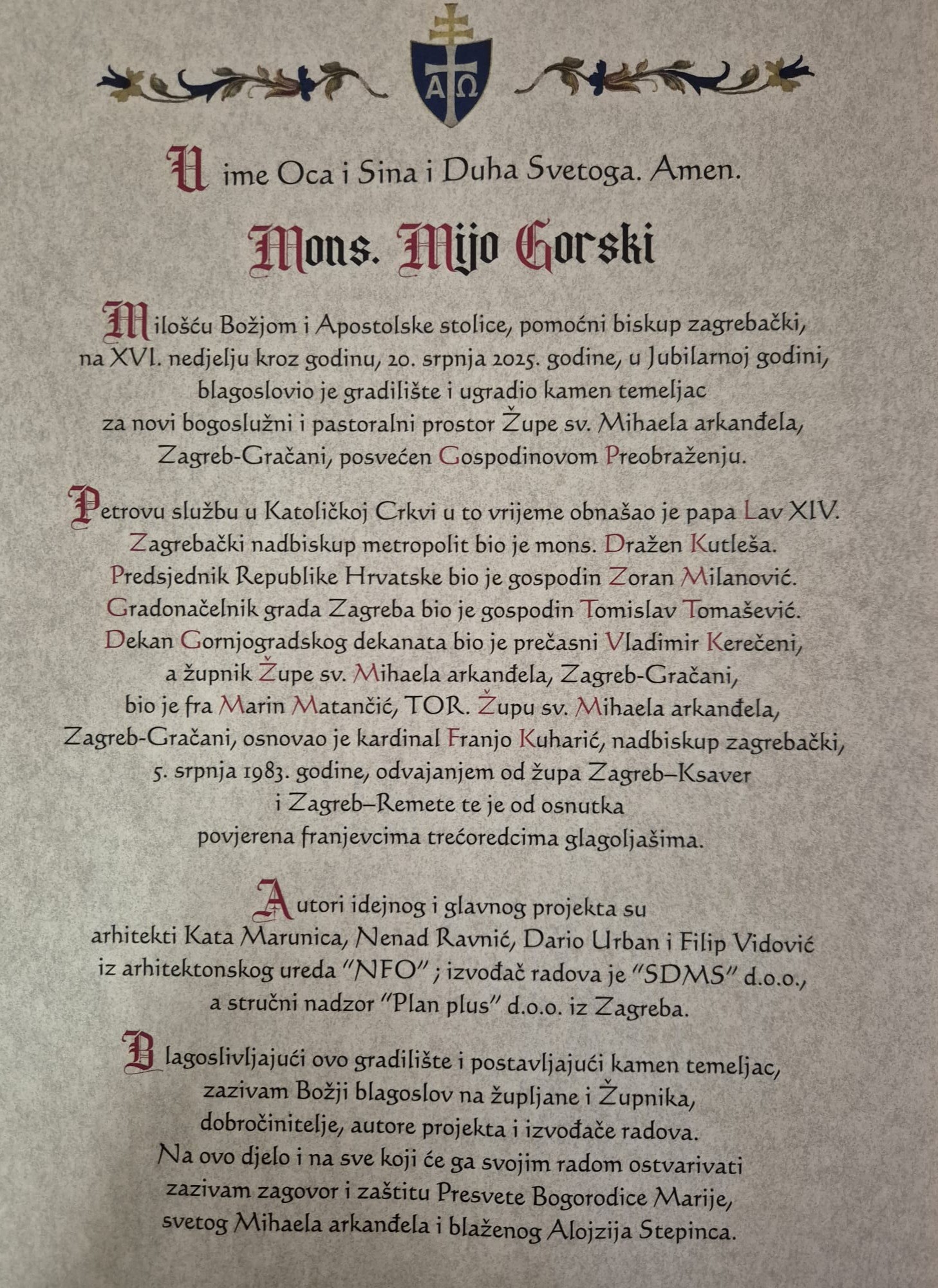 Zagrebački pomoćni biskup Mijo Gorski blagoslovio je u nedjelju 20. srpnja gradilište novoga bogoslužnog i pastoralnog prostora Gospodinova preobraženja u Župi sv. Mihaela u zagrebačkim Gračanima.