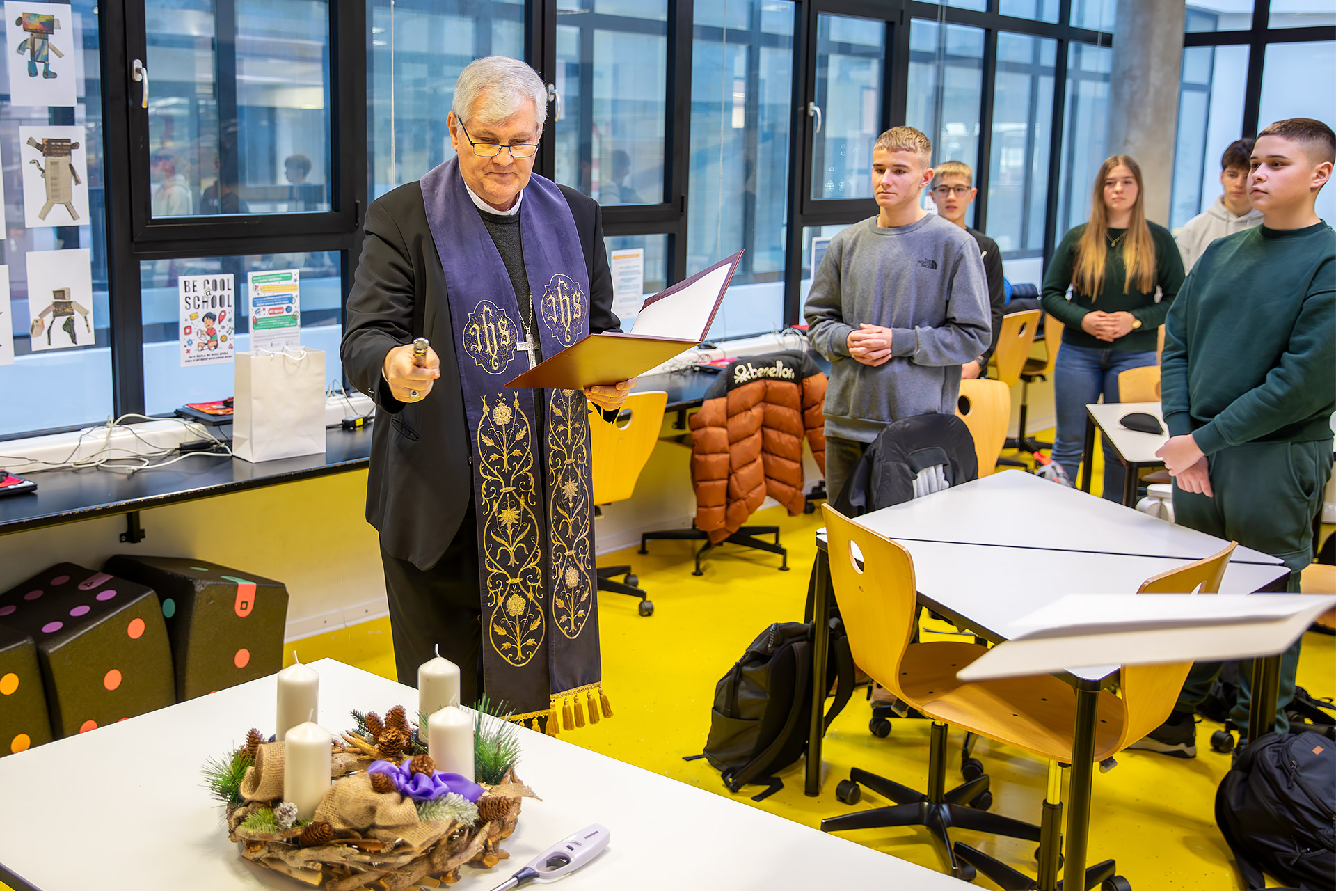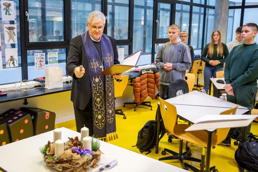 U školi su ga dočekali ravnatelj vlč. Josip Bulat, djelatnici i učenici. Ravnatelj je biskupu ukratko predstavio rad škole koja u ovoj prvoj školskoj godini djelovanja već bilježi niz aktivnosti. U zajedništvu s učenicima i djelatnicima škole, biskup Košić blagoslovio je adventski vijenac te je upaljena prva adventska svijeća, čime je i u ustanovi obilježen ulazak u vrijeme došašća.