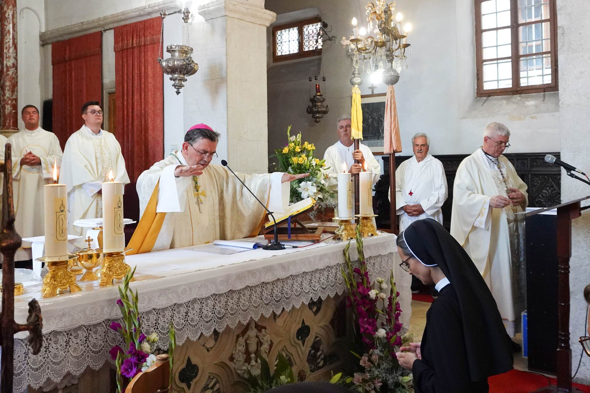 Slavlje je počelo svečanom procesijom od samostana do župne crkve gdje se nazočnima obratio župnik. Čestitao je sestrama koje slave zlatni jubilej redovničkih zavjeta: s. M. Agneti Juka, s. M. Ivanici Bajan, s. M. Gertrudi Anzulović i s. M. Vilmi Gašpar kao i s. M. Lani Pecotić koje će u tom slavlju položiti doživotne zavjete te postulantici s. Mariji Brkić koja će pristupiti redovničkom oblačenju.