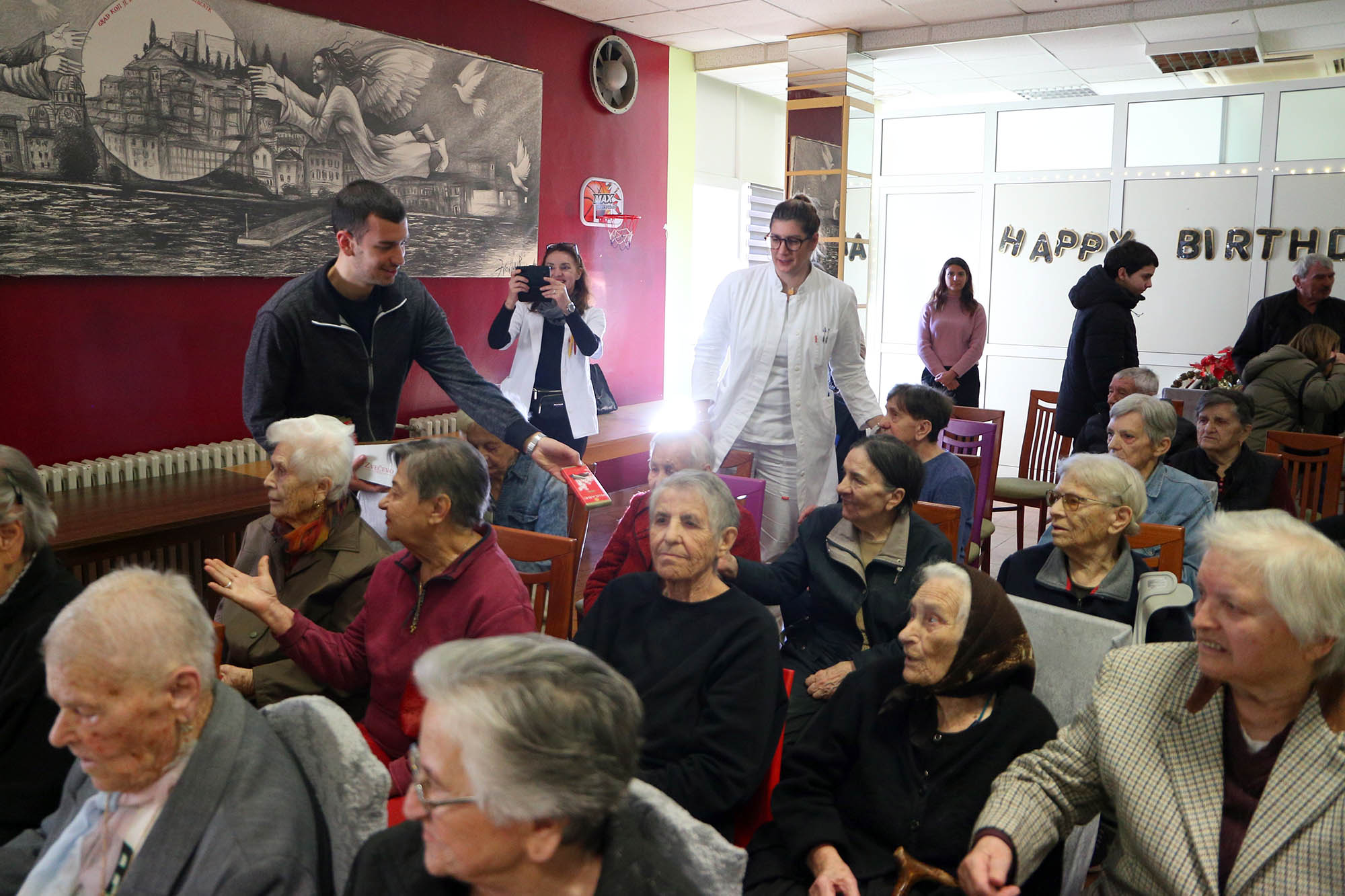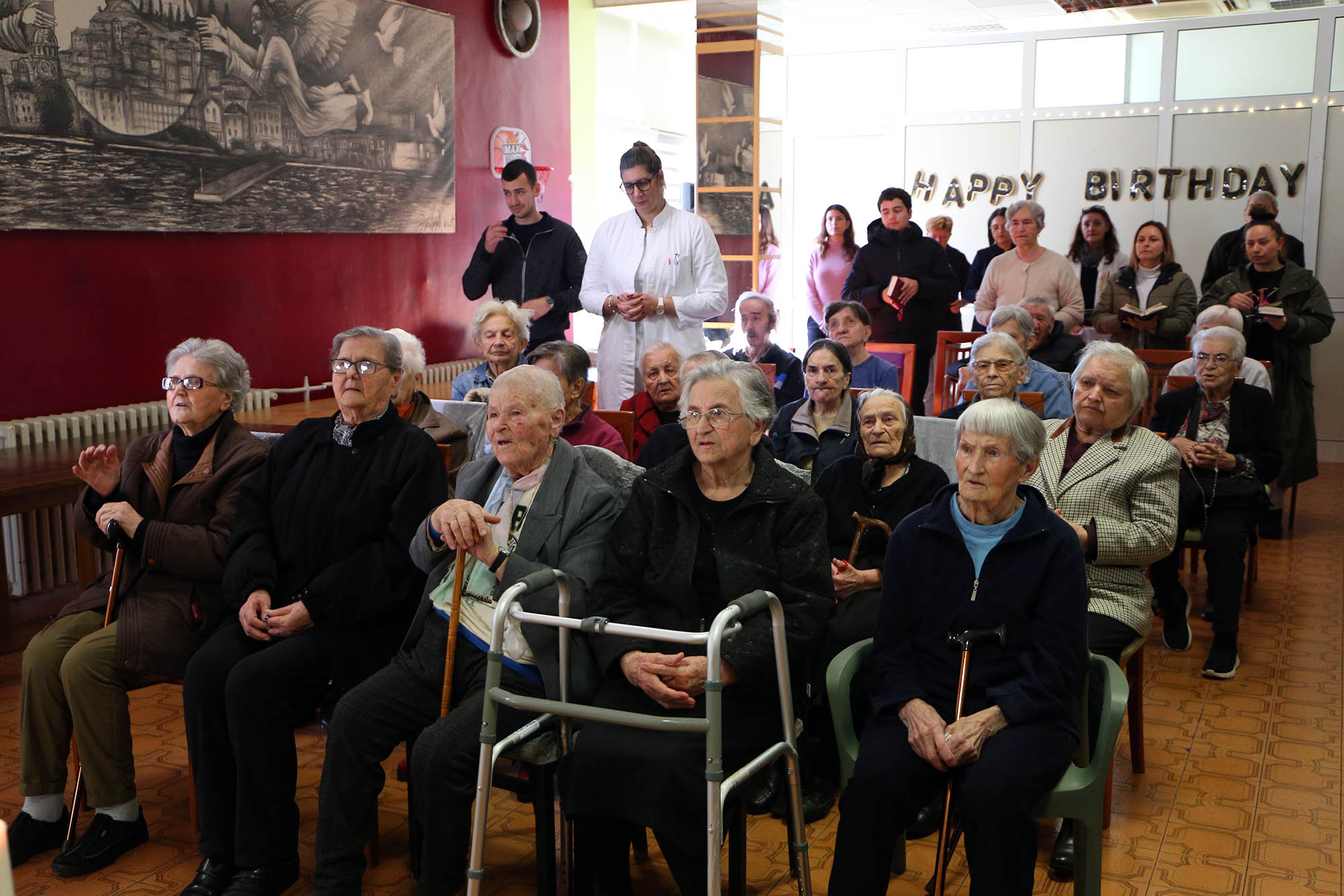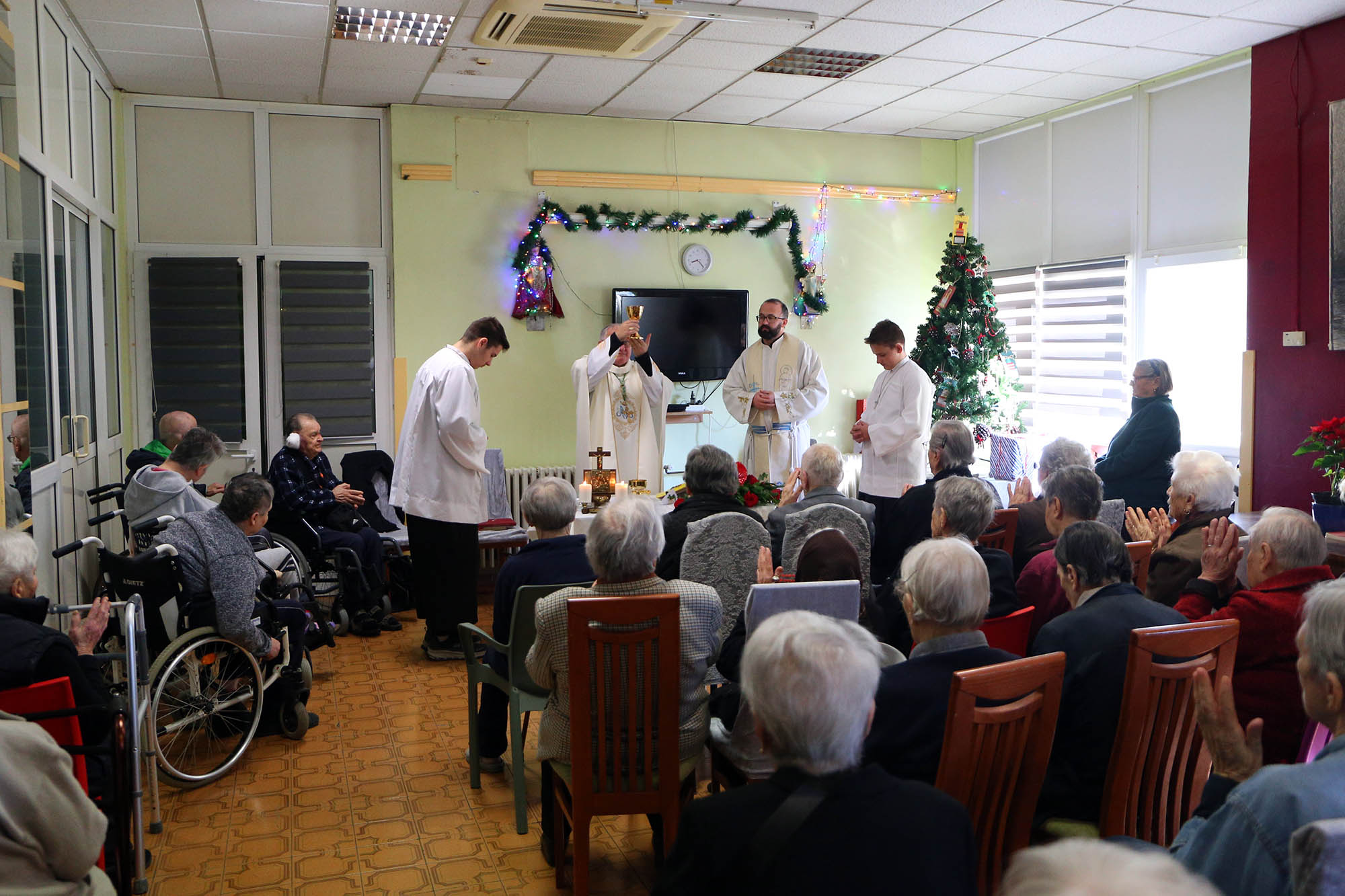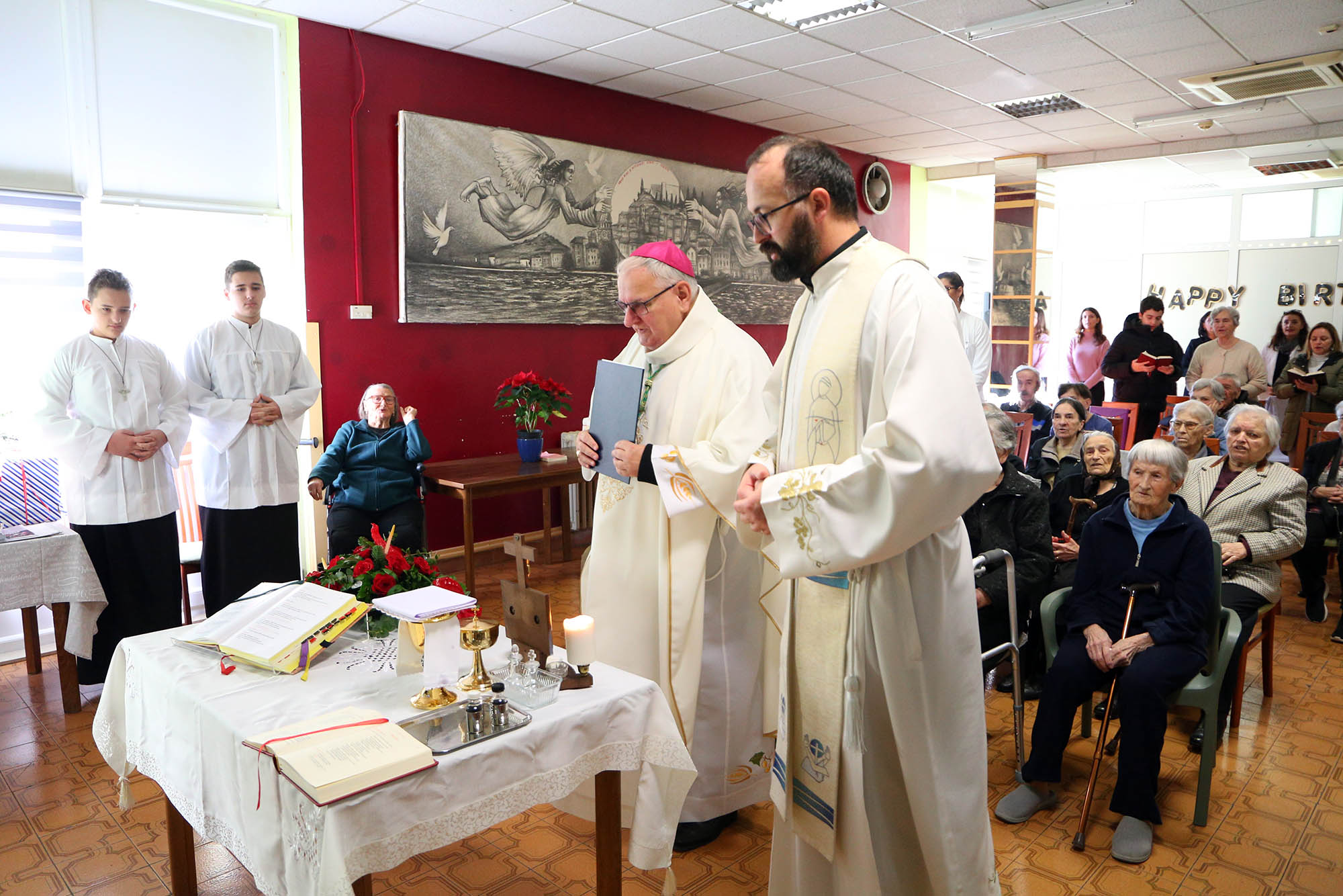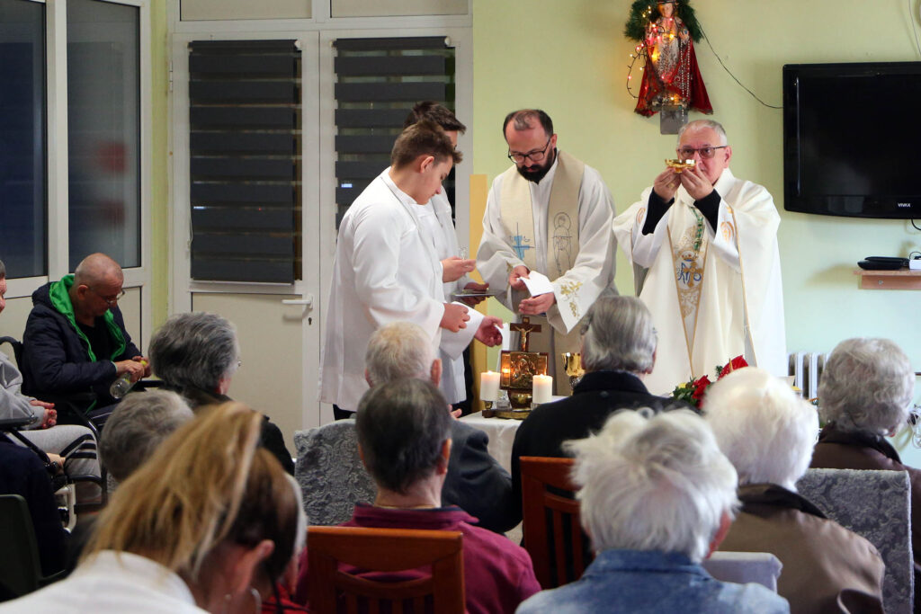 U zajedništvu sa štićenicima i osobljem doma, biskup je predslavio euharistijsko slavlje uz suslavlje župnika Vidika i duhovnika te ustanove fra Željka Klarića. U propovijedi je biskup naglasio kako je Božić događaj u kojem se Svemogući Bog svjesno oblači u nemoć malog djeteta kako bi postao blizak čovjeku. „Nema nemoćnijeg bića od malog djeteta… Bog se zaogrnuo ljudstvom, čovještvom, kao da je odložio svoje božanstvo, da bi svakome od nas omogućio da se jednom zaogrnemo božanstvom“, poručio je biskup Rogić okupljenima.