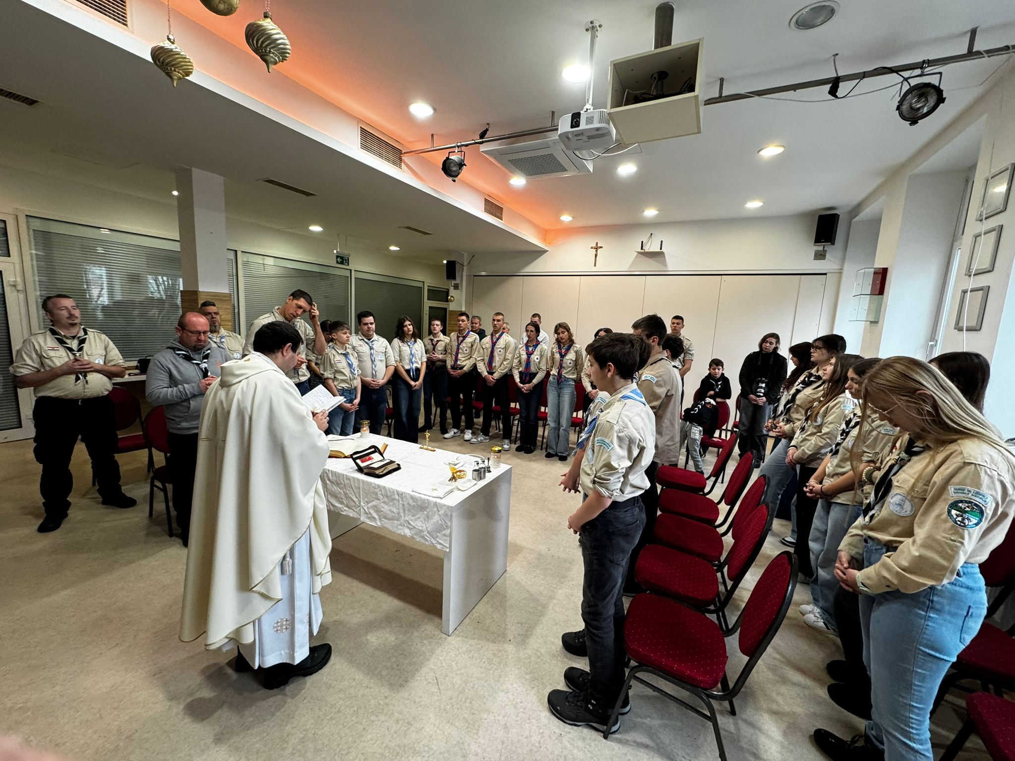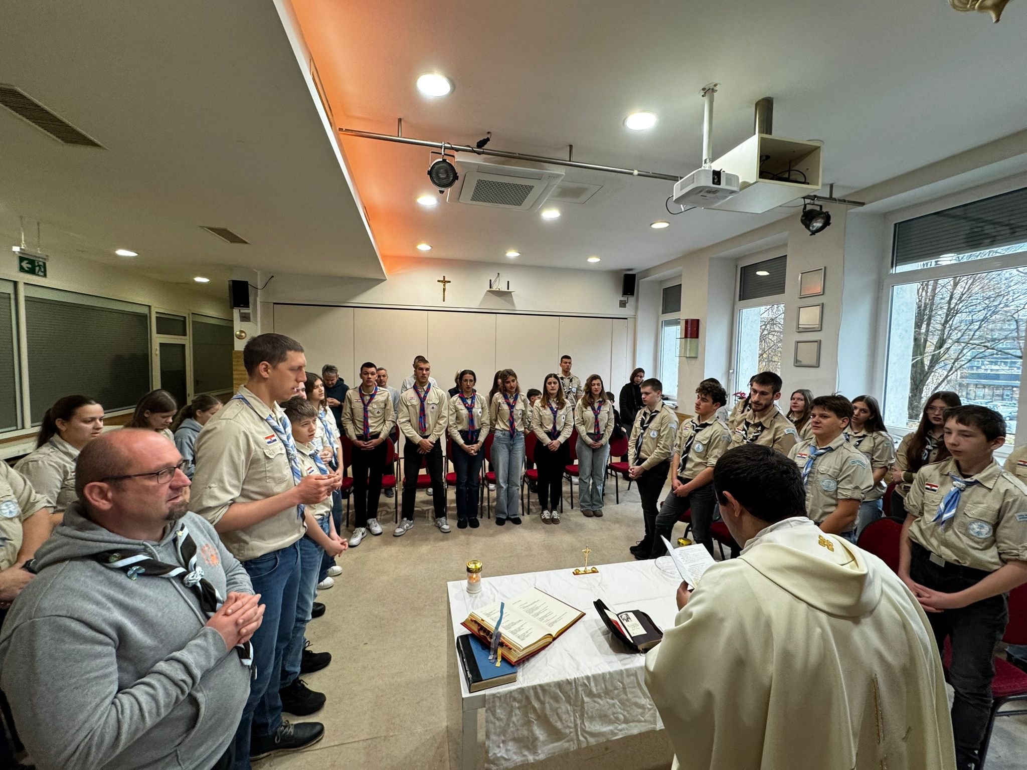 Prije odlaska na svečanu ceremoniju predaje Betlehemskog svjetla, skauti triju biskupija sudjelovali su na misi koju je predvodio duhovnik riječkih katoličkih skauta don Nikola Luketić, uz asistenciju đakona don Tomislava Sikavice.