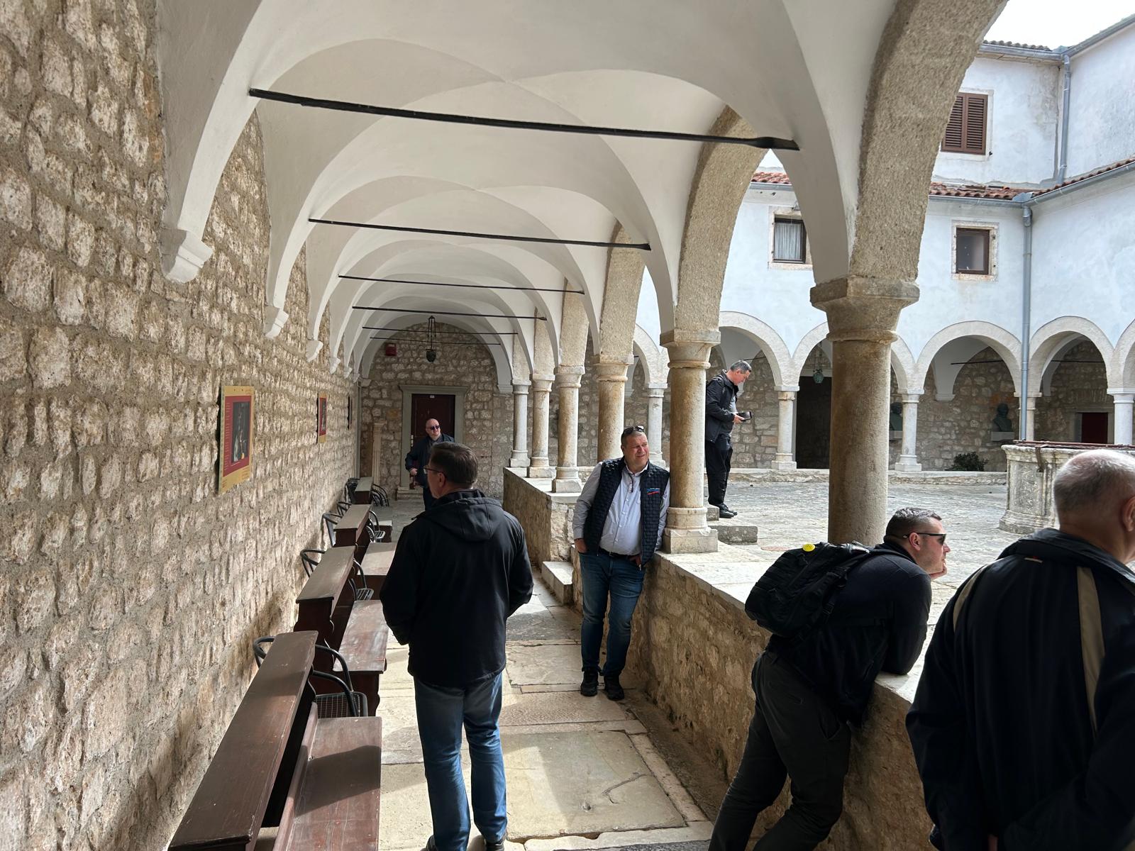 Po dolasku na Cres svećenici su posjetili samostan sv. Frane, gdje su ih dočekali franjevci konventualci. Tijekom obilaska samostana o njegovoj je povijesti govorio vlč. Vitomir Glavaš.