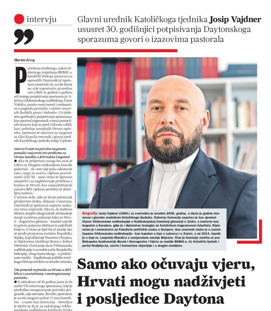 O položaju Hrvata u Bosni i Hercegovini i izazovima tamošnjega pastorala u središnjem intervjuu u Glasu Koncila za nedjelju 7. prosinca govori svećenik i glavni urednik Katoličkog tjednika Josip Vajdner.