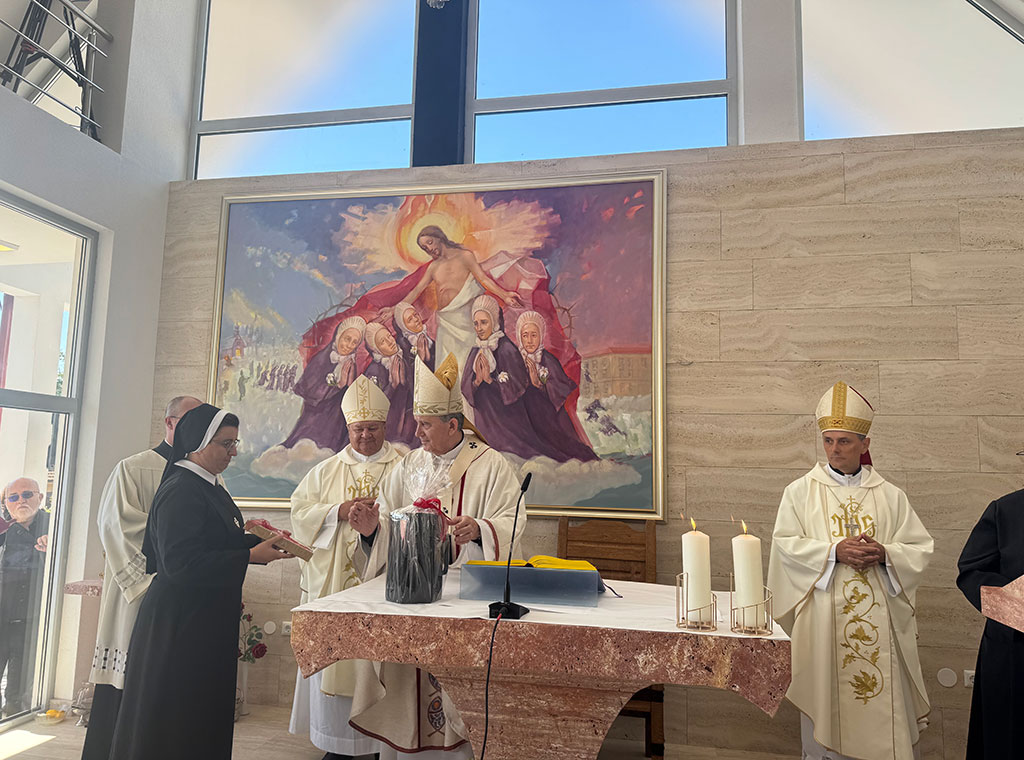 Nakon propovijedi i Vjerovanja uslijedio je obred posvete crkve: molitva litanija Svih svetih, čitanje povelje, posvetna molitva, ugradnja moći u oltar, mazanje oltara i četiri zida krizmenim uljem te kađenje oltara na pet mjesta. Misno slavlje animirale su sestre Kćeri Božje ljubavi.