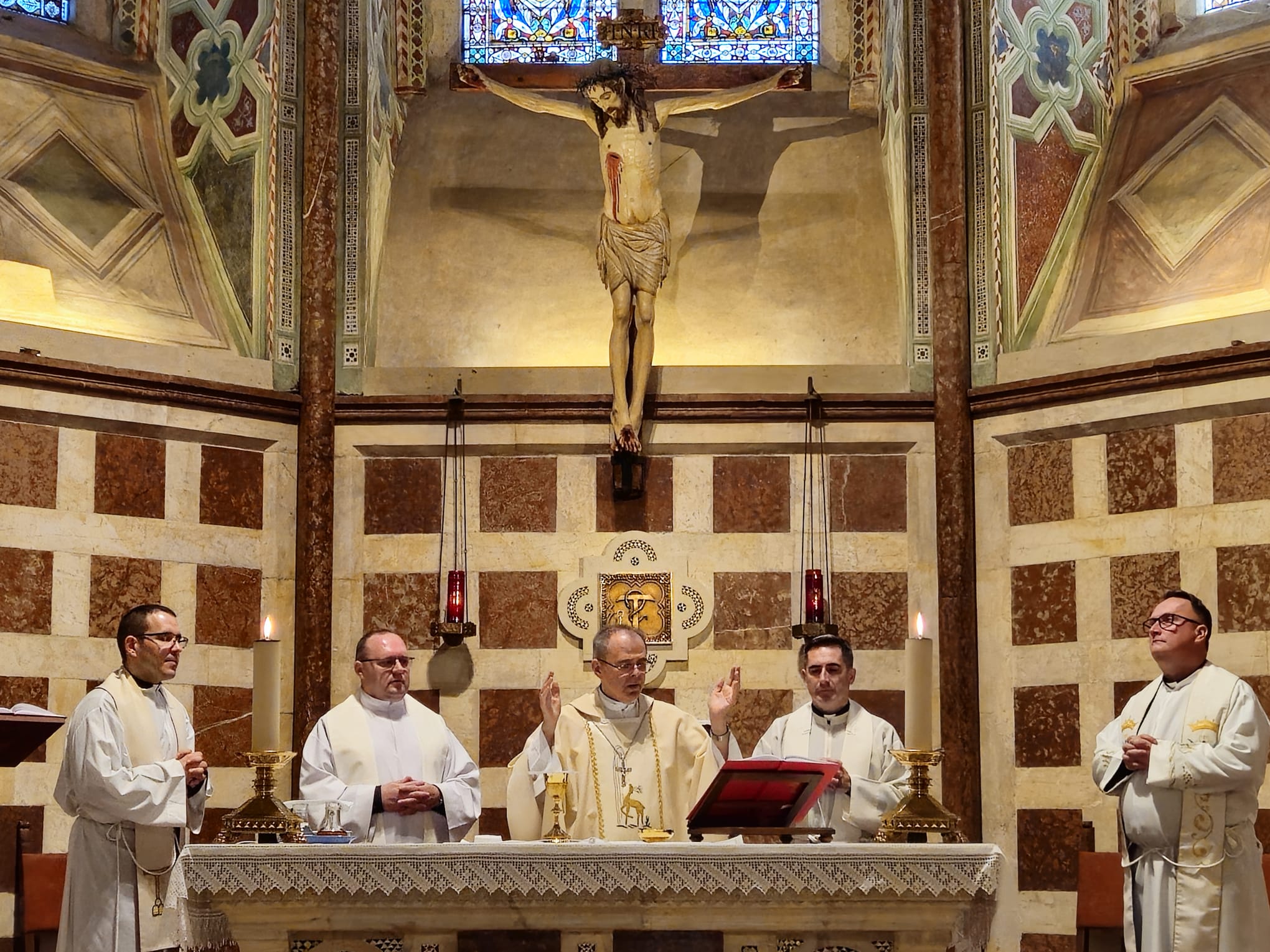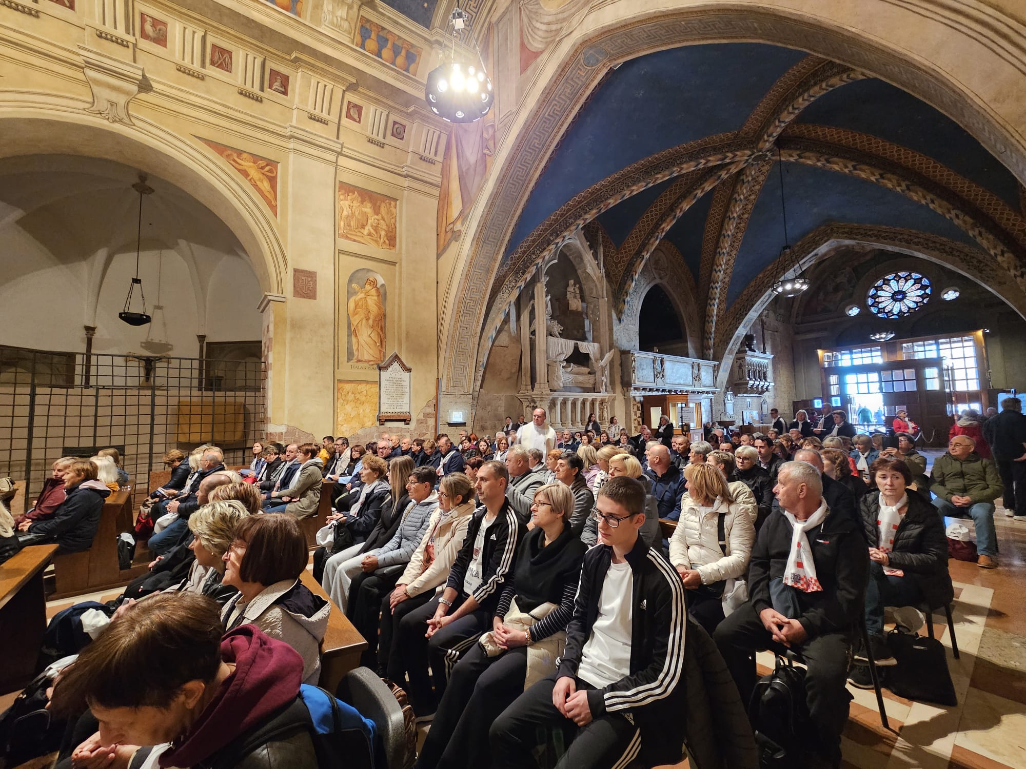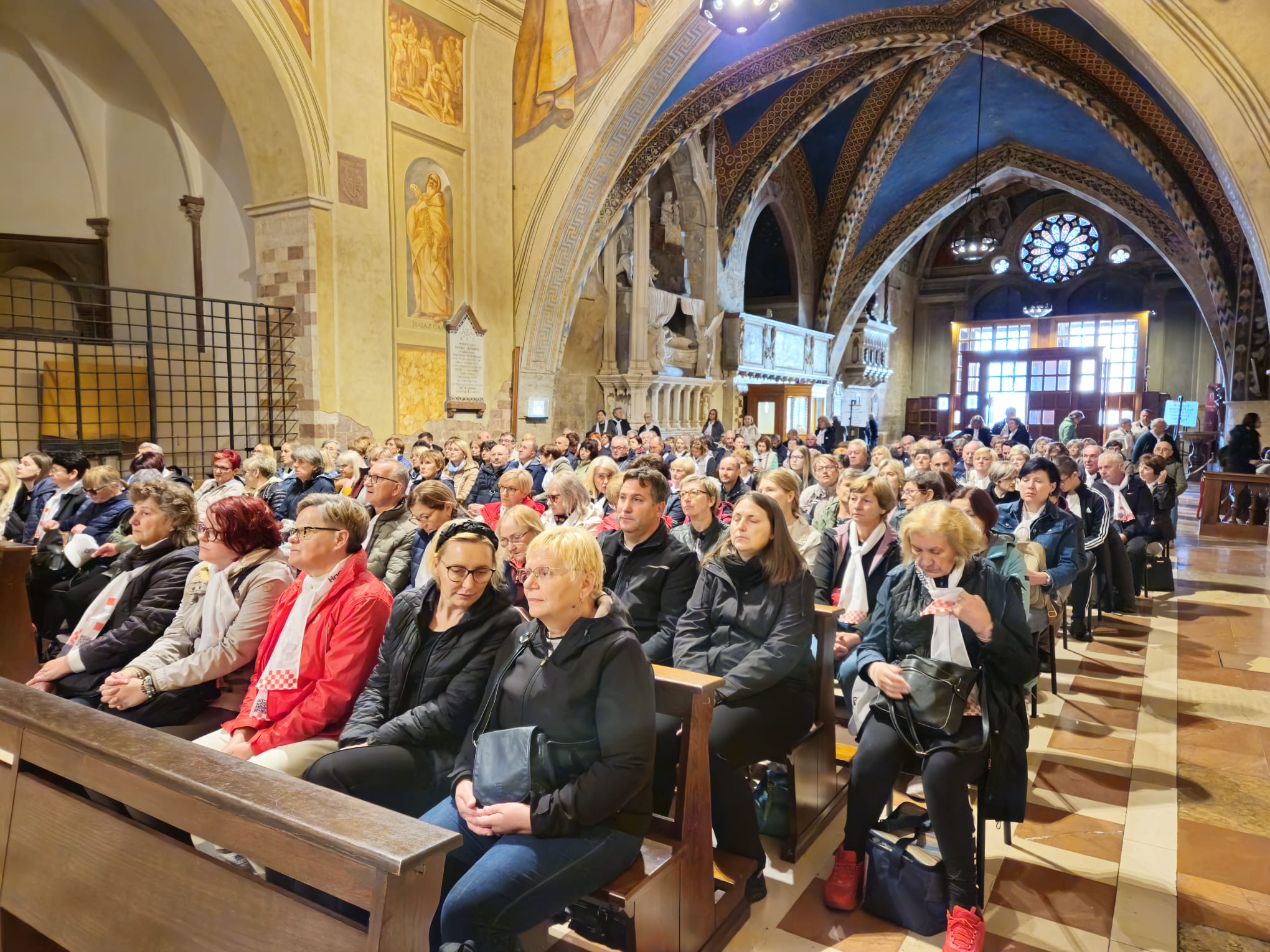 Prva hodočasnička postaja u ponedjeljak, 6. listopada bio je Asiz, grad sv. Franje i sv. Klare, a odnedavno i grad svetog Carla Acutisa. Uz razgledavanje bazilika i molitve na grobovima svetaca hodočasnici su sudjelovali na svetom misnom slavlju koje je predslavio biskup Radoš u bazilici sv. Franje, u Donjoj crkvi u kapeli sv. Katarine.