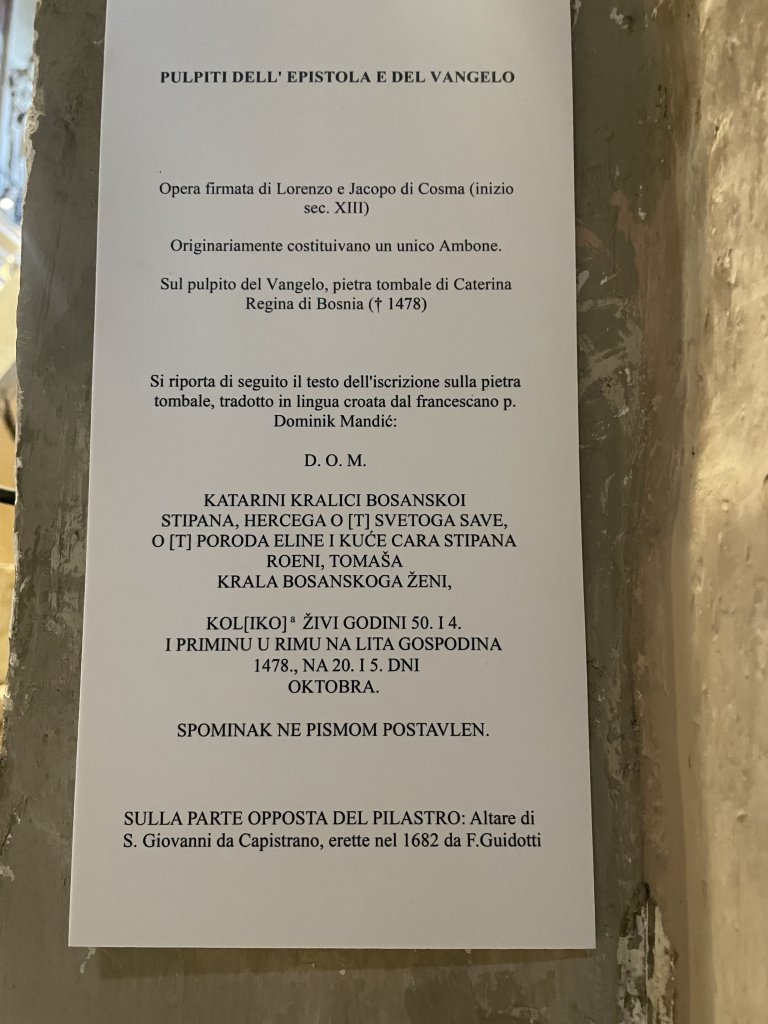 Katarina nije izgubila sebe. I zato njezin grob ovdje u Rimu još uvijek govori. Govori glasom žene, majke, kraljice – koja je znala izgubiti sve, a ostati vjerna. I to je veća pobjeda od svake krune. Godine 1478. Katarina umire ovdje u progonstvu, – daleko od Domovine, ali blizu neba. Obučena u franjevačko znakovlje trećoredice, bez krune, bez dvora, ali s mirom onih koji su naučili da je jedino Kraljevstvo koje vrijedi ono Božje.