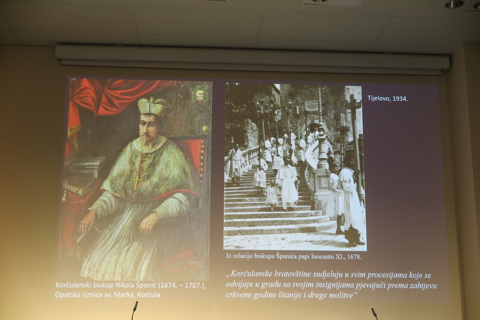 Kroz mnoštvo starih i suvremenih fotografija kao i povijesnih dokumenata dr. Tulić je predstavio neke posebnosti triju očuvanih korčulanskih bratovština, pjesništva na narodnom jeziku, njihovih crkava i kuća, naručivanja umjetničkih djela i procesijskog inventara, dajući kratak pregled crkvene povijesti Korčule koja je u jednom periodu bila biskupija (1300. – 1828./1830.) i imala je ukupno 36 biskupa. To je svakako utjecalo na bogatstvo liturgijskih događanja koja su se obogaćivala, ali i mijenjala pod utjecajem liturgijskih promjena u cijeloj Crkvi.