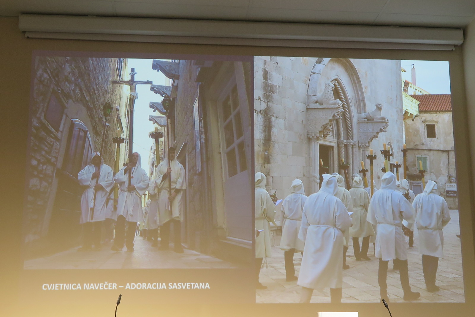 Na predavanju je prikazan i dokumentarni film „Vela setemana u gradu Korčuli“ koji je pomogao publici doživjeti procesije i glavna događanja tog tjedna.