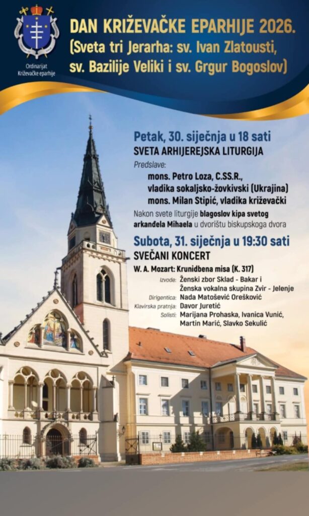 Svečani koncert povodom Dana eparhije s Mozartovom krunidbenom misom održat će se u subotu 31. siječnja u 19:30 u katedrali. Koncert će izvesti Ženski zbor „Sklad“ iz Bakra, Ženska vokalna skupina „Zvir“ iz Jelenja te solisti Mirijana Prohaska, Ivanica Vunić, Martin Marić i Slavko Sekulić pod ravnanjem dirigentice Nade Matošević-Orešković i s klavirskom pratnjom Davora Juretića, izvijestio je Ured za medije Križevačke eparhije.