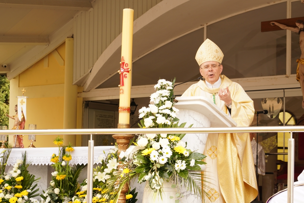 „Kao što je loza priljubljena uz trs, kao što svaki čas imaju dotok života, tako je čovjek priljubljen uz Gospodina… Nismo samo promatrači u odnosu na Boga, nismo samo oni koji gledamo, nego oni koji živimo iz toga trsa“, pojasnio je biskup Radoš te nastavio tumačiti sliku o trsu i lozi, istaknuvši kako je svaki ljudski život potreban čišćenja, baš poput loze, ali i da Vinogradar, Gospodin, po ljudima želi donijeti dobre, „slatke“ plodove poput grožđa ovome svijetu. Kada čovjek čini dobro drugom čovjeku, nije ohol, staje u obranu slabijih i ismijavanih, ne kleveće, po tim dobrim plodovima će se prepoznavati Božji učenici. To su, naglasio je, plodovi Duha Svetoga. Tijekom mise pjevanje je predvodio Zbor mladih Varaždinske biskupije.