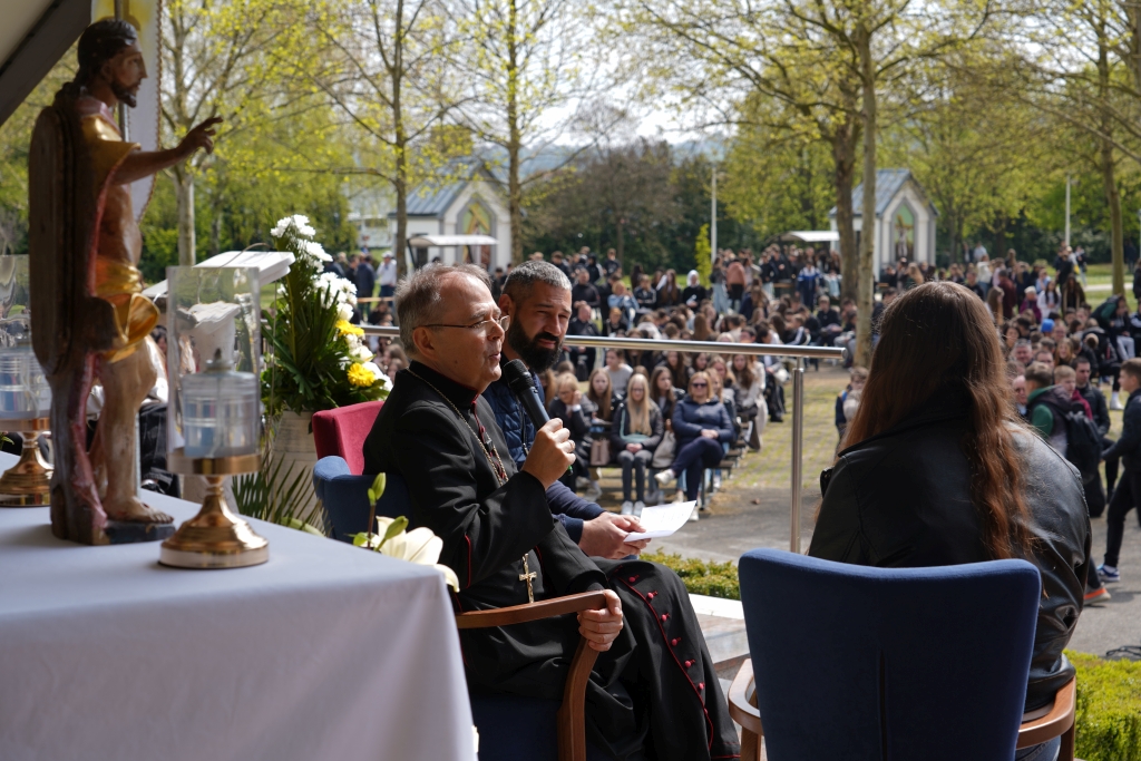 Mladi su na prostor svetišta na otvorenom počeli pristizati u jutarnjim satima, gdje su imali priliku za sakrament ispovijedi. Podijeljeno im je obilježje susreta: narukvice s medaljicama sv. Benedikta koje čine deseticu krunice. Predstojnik Ureda za pastoral mladih Varaždinske biskupije vlč. Matija Filipović pozdravio je okupljene mlade protumačio obilježje, rekavši kako medaljica sama po sebi nema nikakvu čarobnu moći, ali ima moć i snagu onda kad osoba koja ju nosi ili drži u rukama, poput njih okupljenih na ovom susretu, moli čvrstom vjerom. Ta molitva tada, kako je rekao, ima svoju snagu. Vlč. Filipović potom je i predmolio deseticu krunice kojom su se okupljeni pridružili pozivu pape Lava na molitvu za mir, prestanak ratova, mržnje i nepravde.