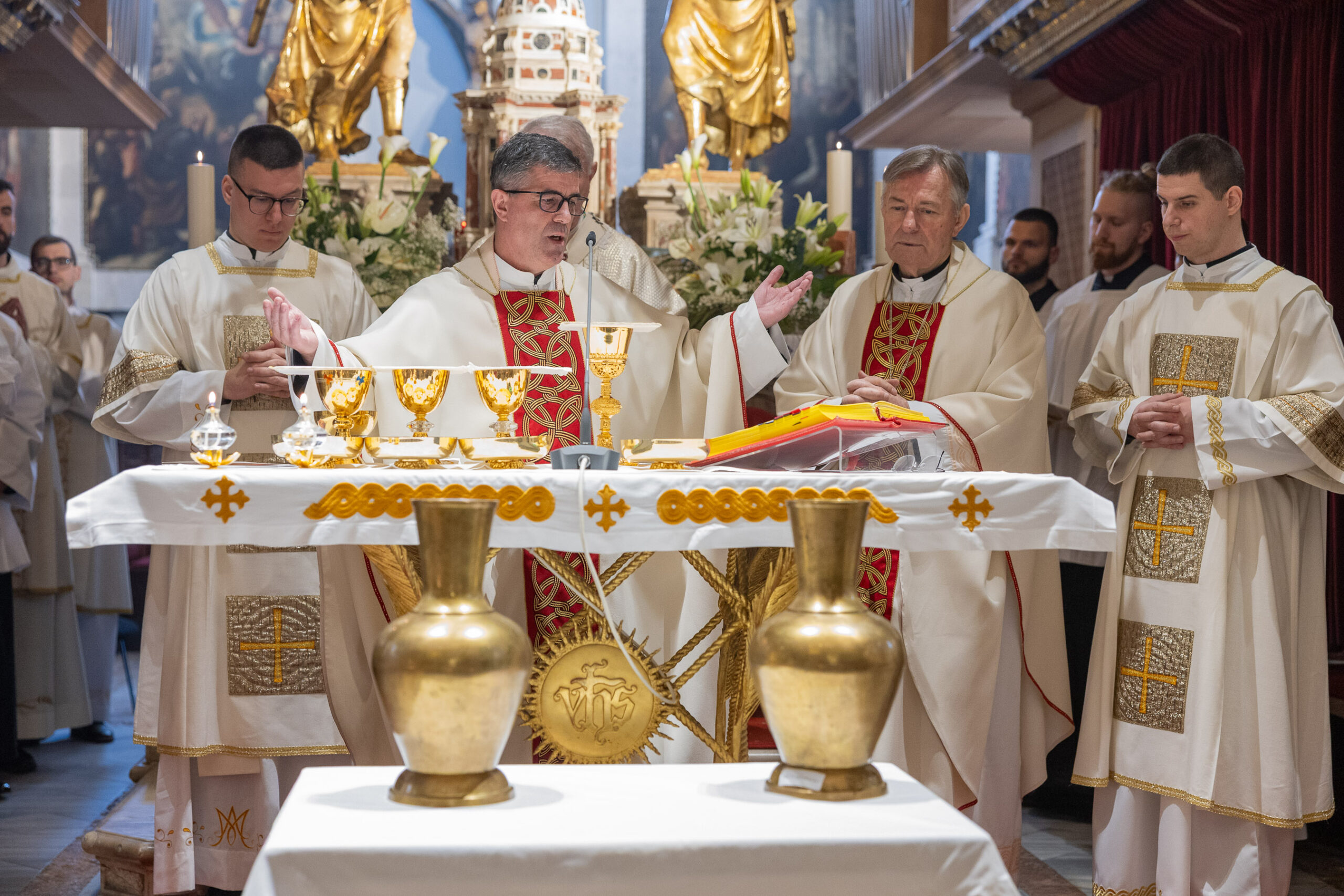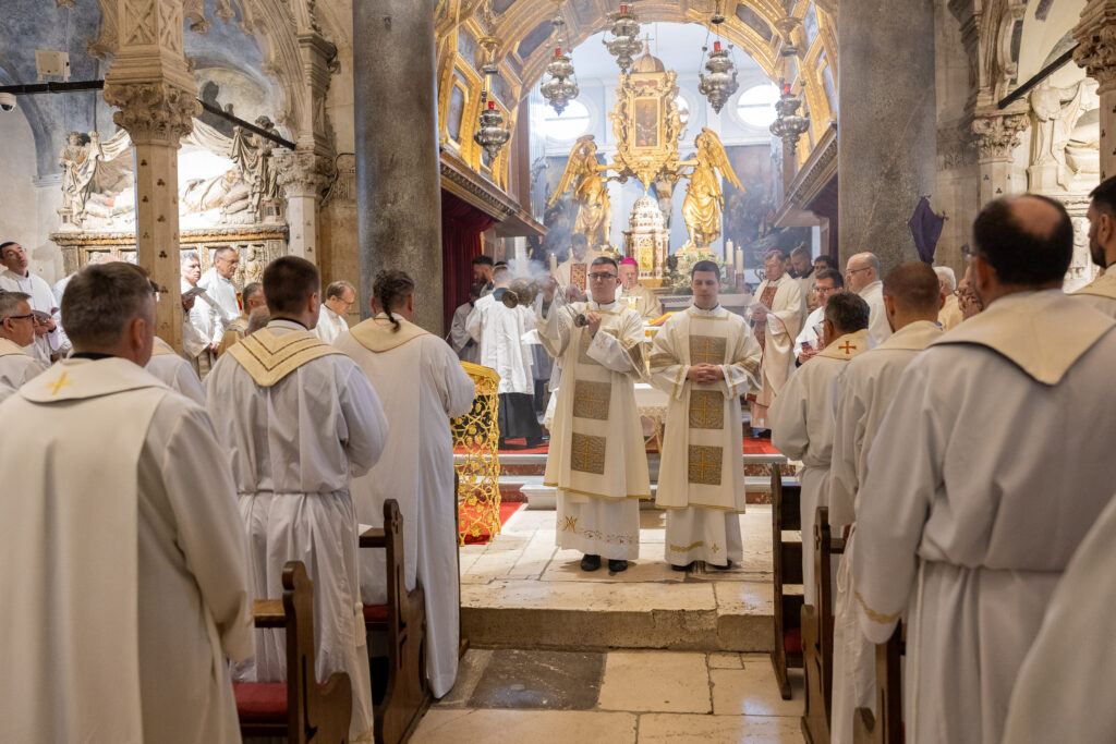 Nakon propovijedi, nadbiskup je posvetio ulja, a zatim je uslijedila euharistijska služba. Na misnom slavlju ministrirali su bogoslovi Centralnog bogoslovnog sjemeništa u Splitu, a liturgijsko pjevanje predvodili su svećenici pod ravnanjem kapelnika splitske prvostolnice maestra don Šime Marovića. Kod oltara su posluživali i đakoni don Mate Bareta i don Antonio Brizić, izvijestio je Tiskovni ured Splitsko-makarske nadbiskupije.