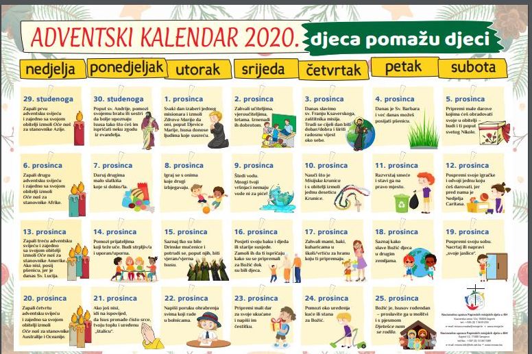 Papinska misijska djela Hrvatske i Bosne i Hercegovine pripremile su materijale namijenjene misijskoj animaciji djece u župnoj zajednici tijekom došašća 2020. godine. Cilj je pripremiti djecu za Dan svetog Djetinjstva, koji se slavi na Bogojavljenje, 6. siječnja. Na taj dan svi prijatelji misija, a osobito djeca, imat će prigodu, molitvama i darovima, pomoći djeci diljem svijeta.