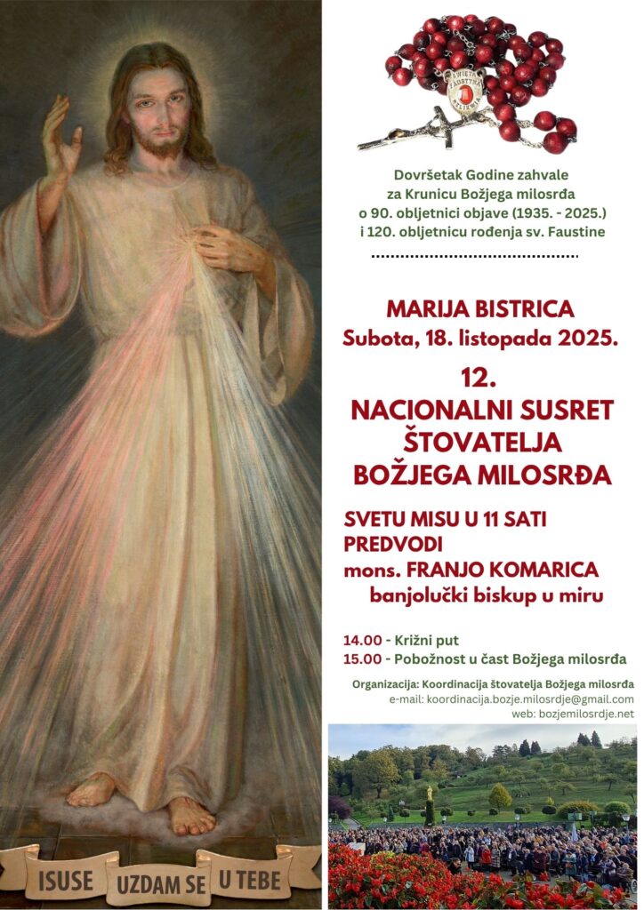 Koordinacija štovatelja Božjega milosrđa gornjim molitvenim nakanama pridružuje i svoje: za blagoslovljen 12. nacionalni susret štovatelja Božjega milosrđa u Mariji Bistrici (18. listopada 2025., predvodi umirovljeni banjolučki biskup Franjo Komarica) i za što skoriju kanonizaciju bl. Alojzija Stepinca.