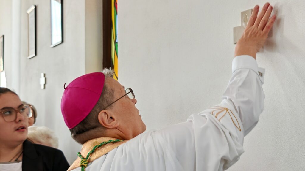 Nakon homilije uslijedila je ispovijest vjere te litanije Svih svetih koje je otpjevao Matija Hećimović. Povelju posvete crkve i oltara pročitala je župljanka Antonija Wurzberg. Povelja je zajedno s moćima mučenika i prezbitera bl. Miroslava Bulešića pohranjena u novi oltar. Potom je nadbiskup Đuro izmolio Posvetnu molitvu te krizmanim uljem pomazao oltar i stijene crkve. Obred je nastavljen paljenjem tamjana te kađenjem oltara. Nakon što je oltar ukrašen svečanim oltarnikom i cvijećem upaljene su svijeće i crkva je zasjala u punom svjetlu. U prikaznoj procesiji sudjelovali su župljani i župljanke odjeveni u svečane narodne nošnje prinoseći darove na oltar.