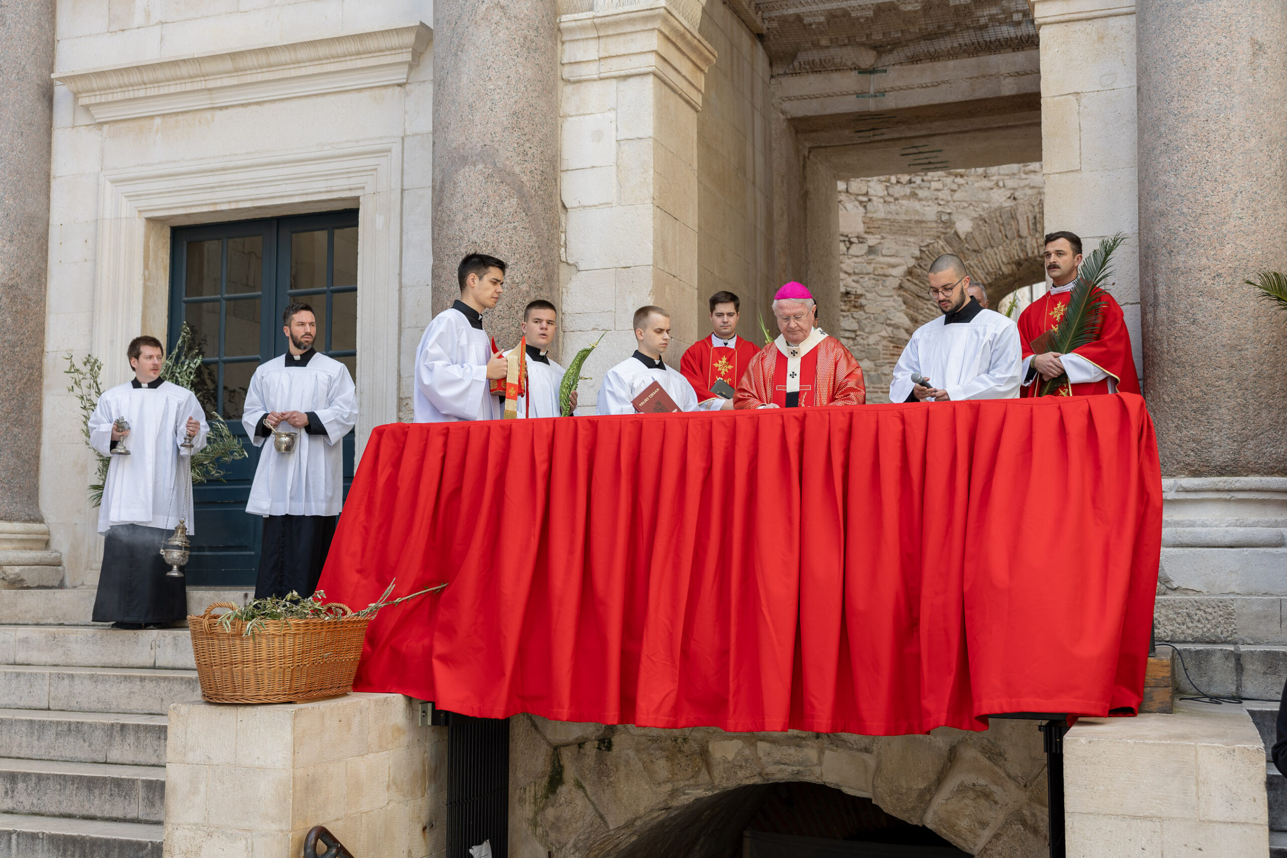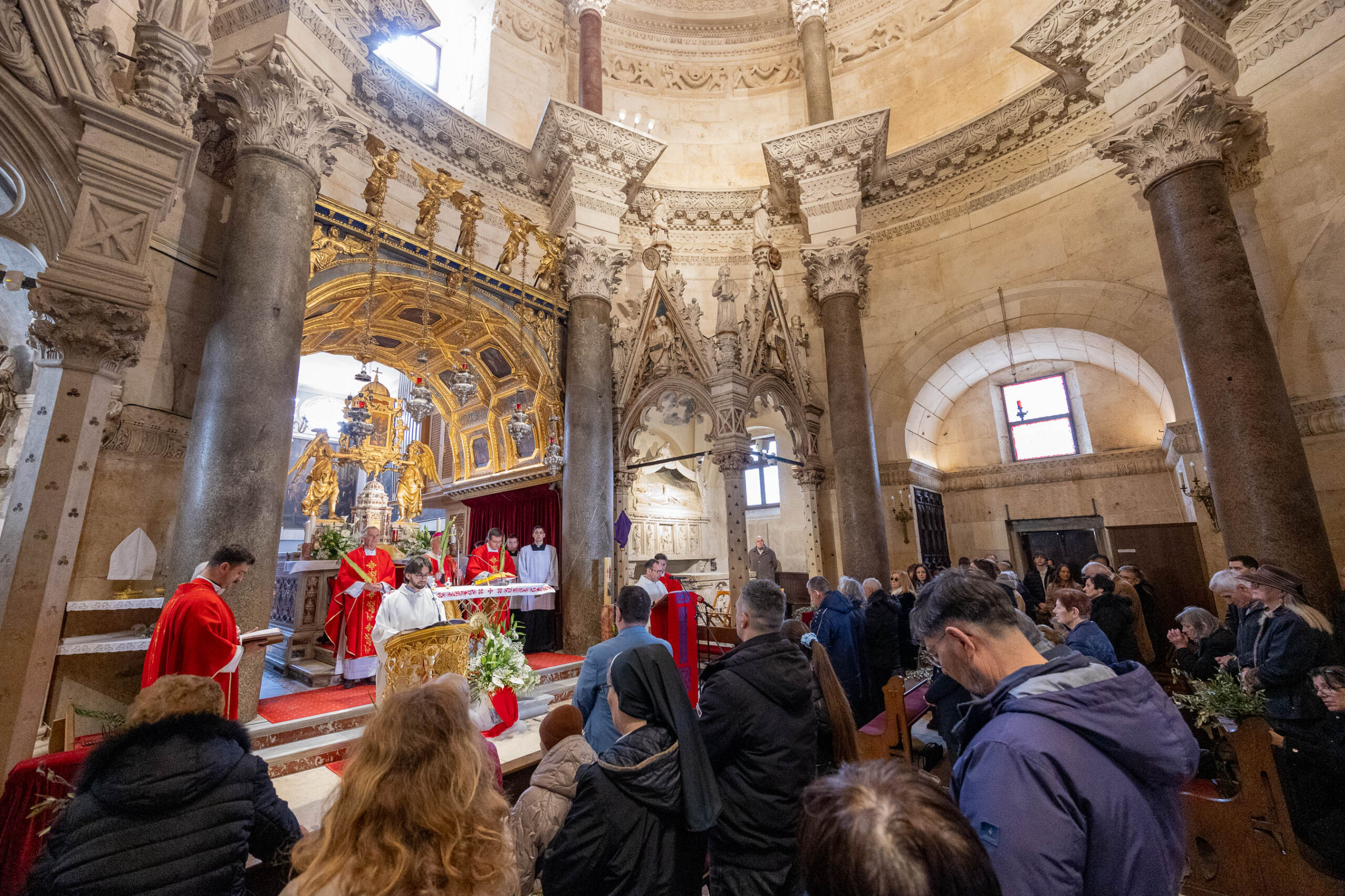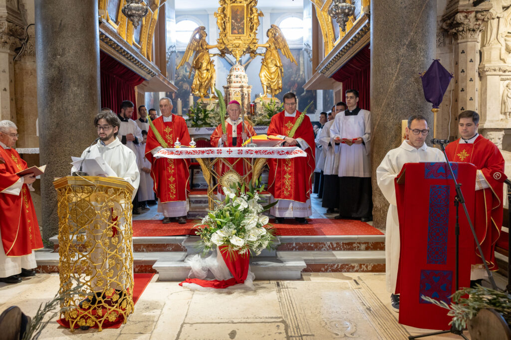 Slavlje je počelo na Peristilu gdje je mons. Križić blagoslovio maslinove grančice i vjernike. Služba riječi i euharistijsko slavlje zatim je nastavljeno u katedrali. Suslavila su petorica svećenika predvođena generalnim vikarom Splitsko-makarske nadbiskupije mons. Franjom Frankopanom Velićem.