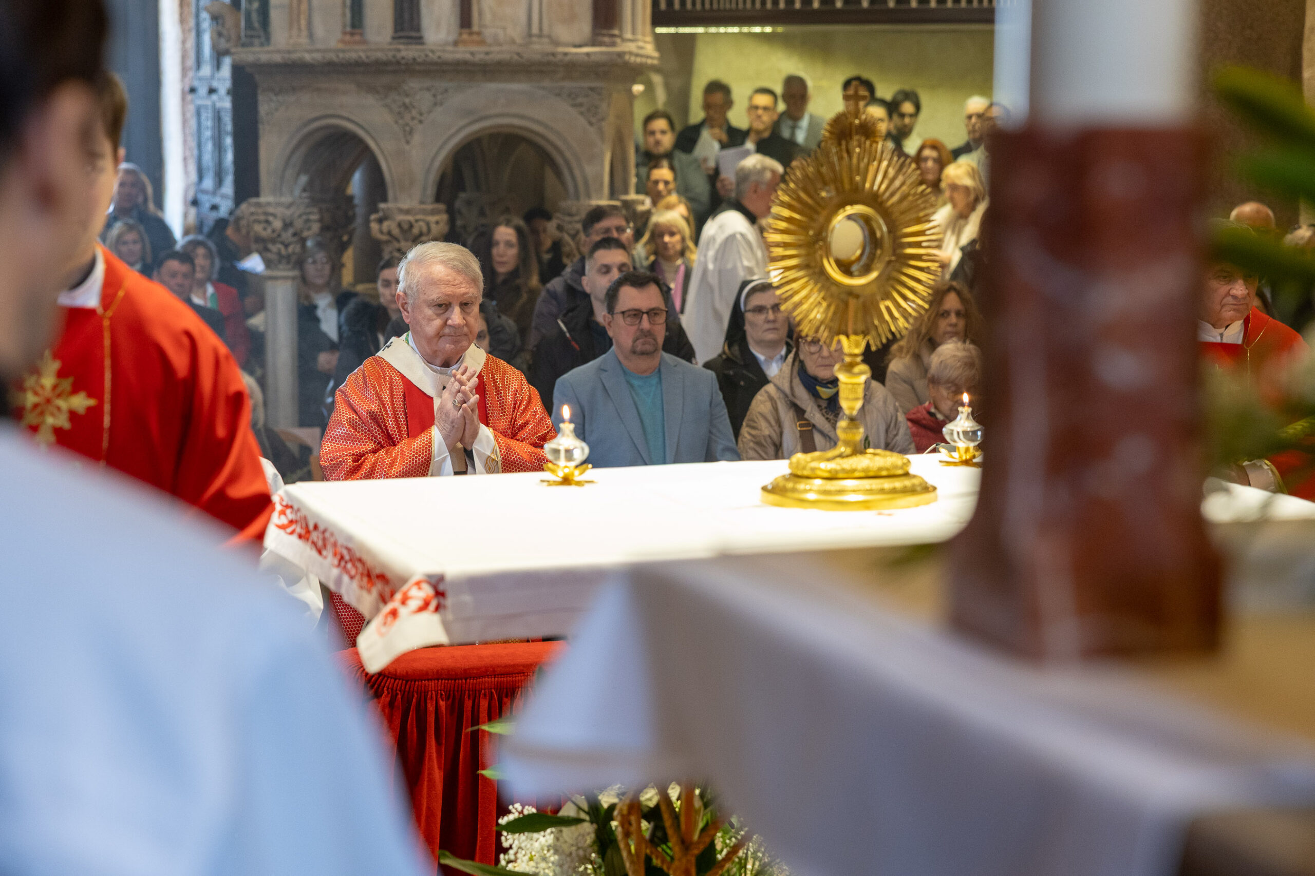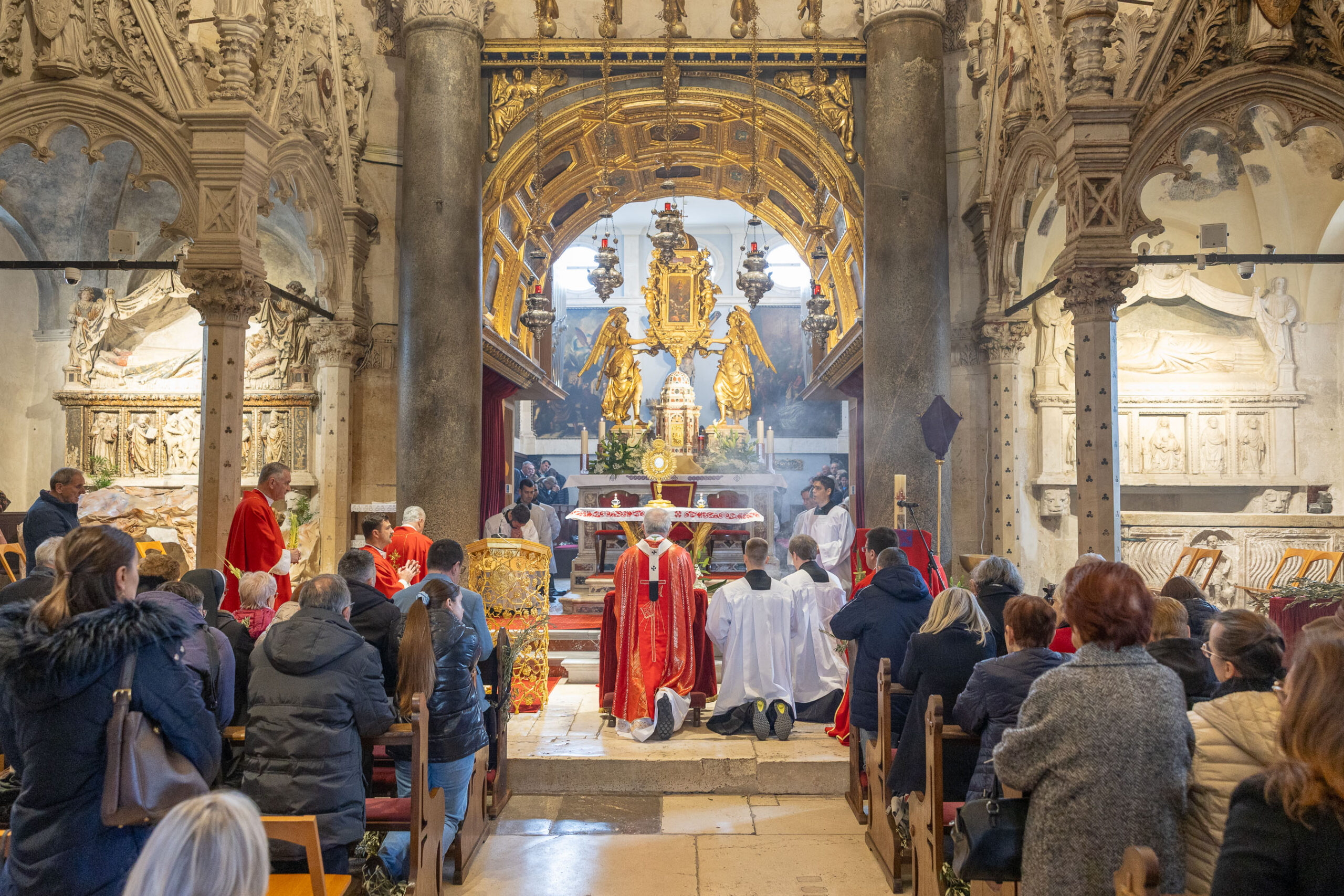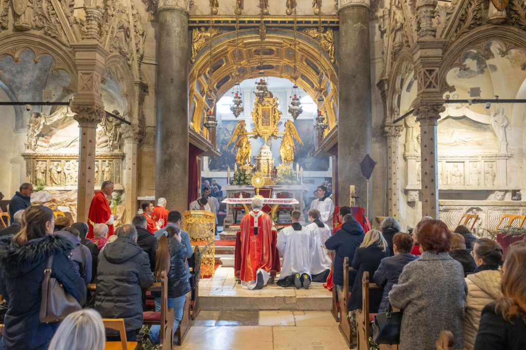 Liturgijsko je pjevanje predvodio Mješoviti prvostolni zbor sv. Dujma pod ravnanjem kapelnika don Šime Marovića uz orguljašku pratnju maestra Mirka Jankova, a bogoslovi splitskog Centralnog bogoslovnog sjemeništa su ministrirali. Nakon euharistijskoga slavlja, izlaganjem Presvetoga Oltarskog Sakramenta započelo je četrdesetosatno klanjanje. Klanjanje je u početku Velikoga tjedna drevni običaj koji se svake godine obavlja u svim župama Splitsko-makarske nadbiskupije, a u katedrali je po tradiciji trodnevno te će završiti u srijedu svečanom misom koju će predvoditi nadbiskup Križić, izvijestio je Tiskovni ured Splitsko-makarske nadbiskupije.