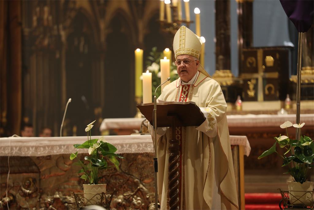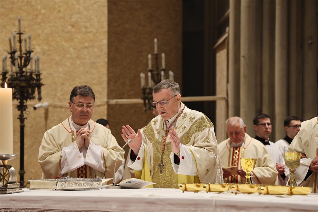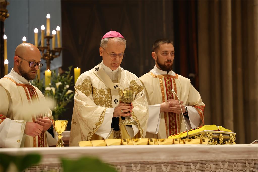 Propovijedao je mons. Vlado Razum koji je istaknuo da se ti dani Vazmenog trodnevlja mogu nazvati srcem liturgijske godine. Pojasnio je da je na Veliki četvrtak Isus, u zajedništvu sa svojim učenicima, ustanovio „veliko otajstvo svoje ljubavi – euharistiju“ te slaveći ju Crkva već živi životom spašenih jer „Tko blaguje tijelo moje i pije krv moju, ima život vječni“ (Iv 6, 55). Zbog toga euharistija „mora postati vrhunac svih naših prioriteta i ništa nam od nje ne bi smjelo biti važnije“, rekao je biskup Razum.