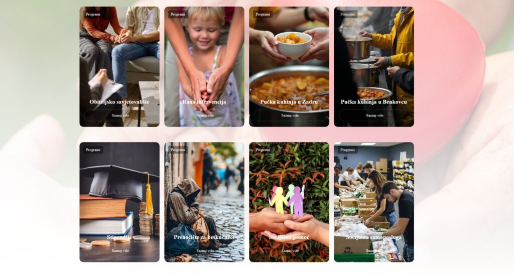 To su službe Obiteljskog savjetovališta, Kabineta za ranu intervenciju u rehabilitaciji djece i podršci njihovim obiteljima, Pučke kuhinje u Zadru i Benkovcu, financijska potpora kroz program stipendija studentima iz socijalno ugroženih obitelji, Prenoćište za beskućnike, Socijalna služba koja pruža financijsku pomoć obiteljima bez stabilnih prihoda, starijim i bolesnim osobama, samcima i pojedincima u riziku od siromaštva te osobama bez podrške ili s minimalnim primanjima.