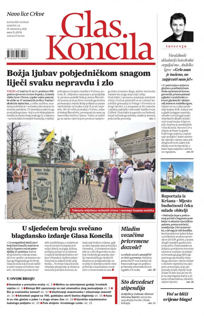 Naslovnom fotografijom na kojoj je zaustavljen trenutak u kojemu je požeški biskup Antun Škvorčević predvodio molitvu kod memorijala „U Majčinu naručju“ unutar Gospina svetišta u Voćinu te s odgovarajućim izvještajem o komemoraciji i zadušnici u povodu 30. obljetnice stradanja 47 nemoćnih civila i samog voćinskog svetišta, nudi se čitateljima novi broj Glasa Koncila, 51. i pretposljednji u ovoj 2021. godini, s nadnevkom od nedjelje 19. prosinca.