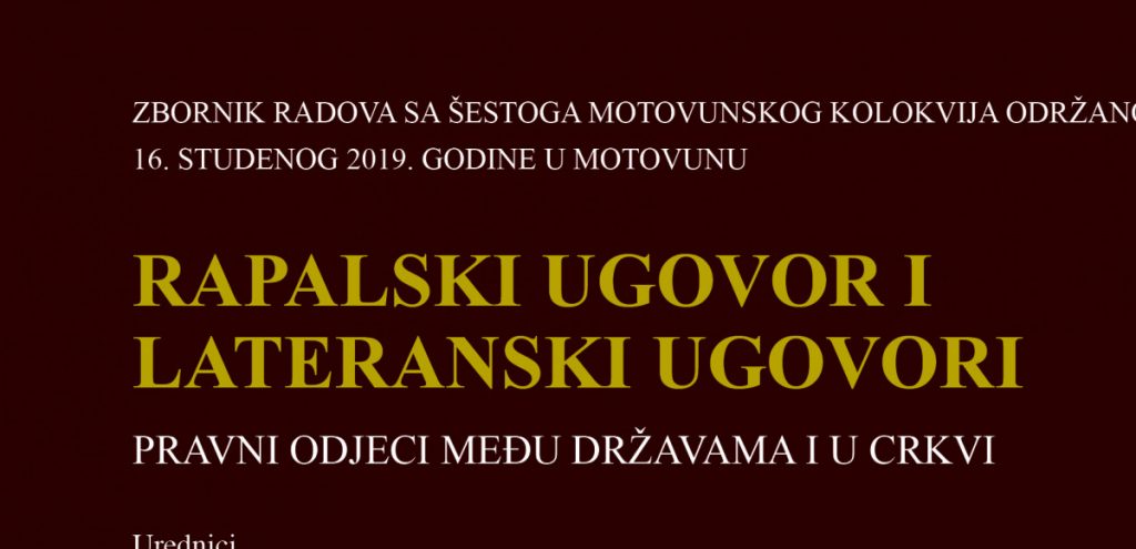 O stogodišnjici Rapalskog ugovora koja pada na dan 12. studenog, dvojica pravnika – izv. prof. dr. sc. Ivan Milotić i odvjetnik Tomislav Sadrić – priredili zbornik radova o Rapalskom ugovoru i Lateranskim ugovorima te njihovim pravnim odjecima među državama i u Crkvi, s posebnim naglaskom na Istru i kvarnerske otoke.