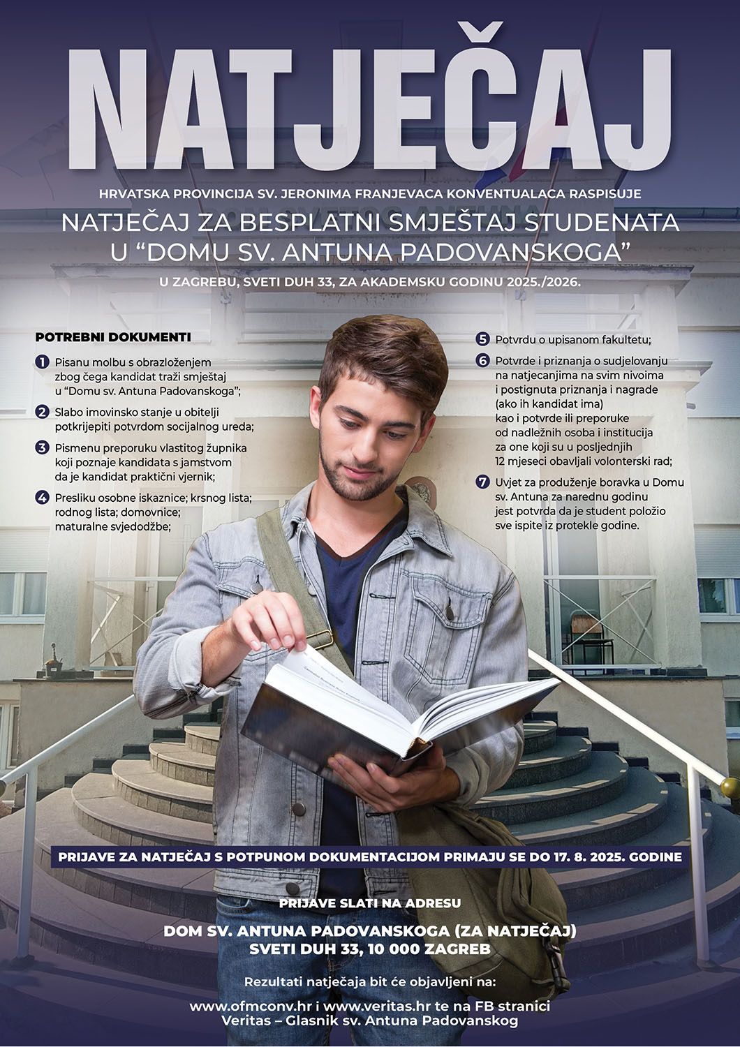 Hrvatska provincija sv. Jeronima franjevaca konventualaca raspisala je u petak 11. srpnja 2025. natječaj za besplatni smještaj studenata tijekom akademske godine 2025./2026. u Domu sv. Antuna Padovanskoga u Zagrebu (Sveti Duh 33).