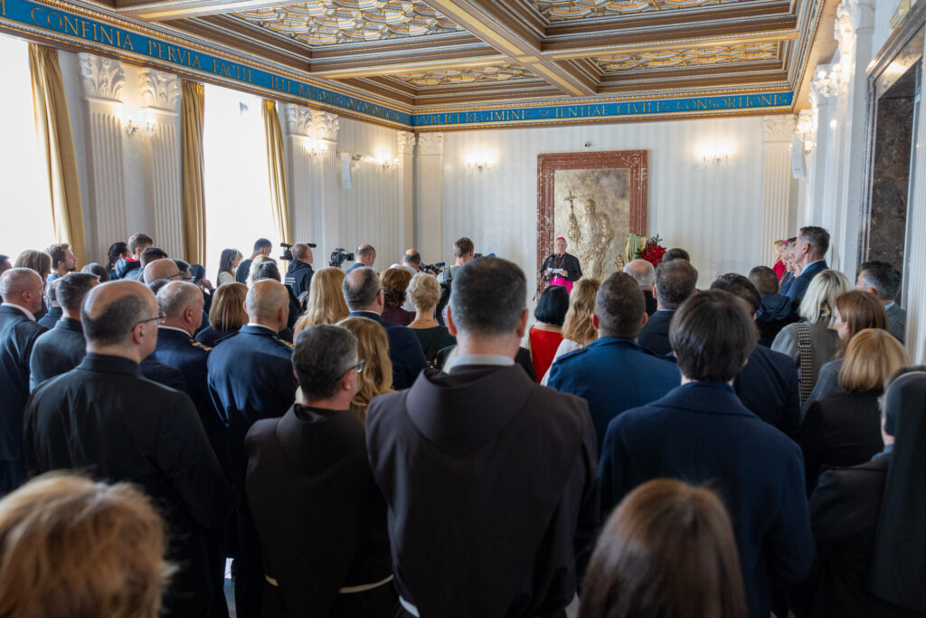 Na kraju je svoju čestitku uputio nadbiskup Križić, koji je u obraćanju okupljenima podsjetio na važne događaje koji su obilježili godinu na izmaku te na izazove i projekte koji stoje pred Crkvom i društvom. Osvrnuo se na smrt pape Franje i izbor novoga pape Lava XIV., istaknuvši kontinuitet Crkve i njezino poslanje u suvremenom svijetu. Spomenuo je i velike crkvene i nacionalne obljetnice, osobito 1100. obljetnicu Hrvatskoga Kraljevstva i Splitskih crkvenih sabora, kao i Posvetu hrvatskoga naroda Presvetom Srcu Isusovu, naglasivši njezinu duhovnu važnost i aktualnost.