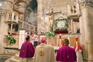 Proslava svetkovine sv. Mihovila, zaštitnika grada Šibenika i Šibenske biskupije, otvorena je Službom svjetla i pjevanim Povečerjem u nedjelju 28. rujna 2025. u katedrali sv. Jakova u Šibeniku.