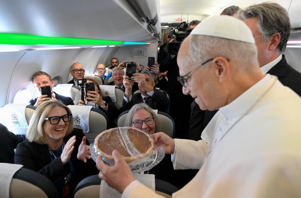 Sveti Otac potom je pozdravio novinare jednog po jednog, provlačeći se kroz uski prolaz zrakoplova, izmjenjujući rukovanja, smijeh, šale i fotografiranja. Mnogi novinari donijeli su mu darove, poput pite od bundeve povodom Dana zahvalnosti te kompleta papuča i čarapa s obilježjima Papina omiljenog bejzbolskog kluba Chicago White Soxa.