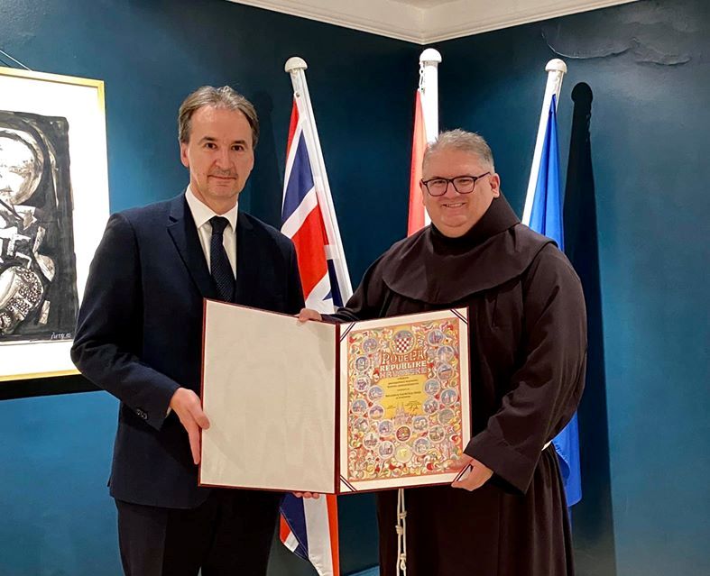 Uime predsjednice Republike Hrvatske Kolinde Grabar Kitarović veleposlanik Republike Hrvatske u Ujedinjenoj Kraljevini Igor Pokaz uručio je u Hrvatskom veleposlanstvu u Londonu u utorak 17. prosinca Povelju Republike Hrvatske voditelju Hrvatske katoličke misije u Londonu fra Ljubomiru Šimunoviću.