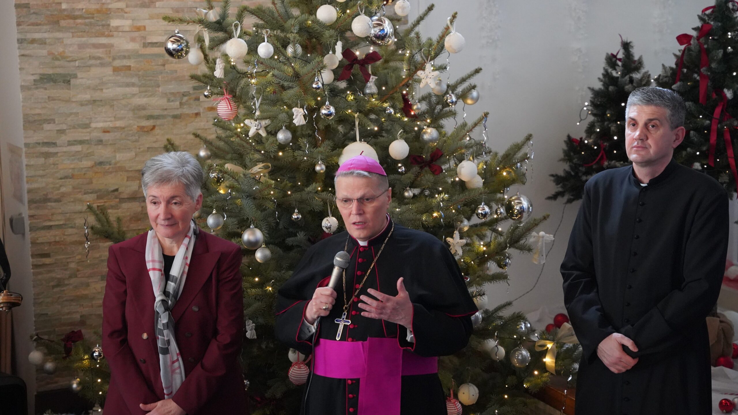 Prigodnu dobrodošlicu izrekla je ravnateljica Doma dr. Štefica Mikšić, izričući radost zbog posjeta, kako osobnu tako i zajedničku, uime nazočnih korisnika i svih djelatnika i djelatnica. Potom je nadbiskup svima čestitao Božić te održao prigodni nagovor u kojem je potaknuo korisnike i djelatnike Doma na međusobnu ljubav i uvažavanje, ističući „da smo potrebni jedni drugih jer je i sam Bog poželio biti jedan od nas i treba nas.“