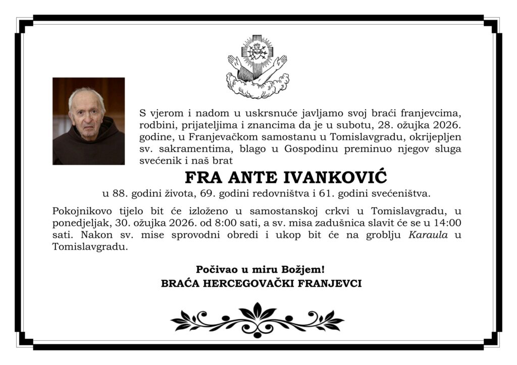 Član Hercegovačke franjevačke provincije Uznesenja Blažene Djevice Marije fra Ante Ivanković, OFM, preminuo je u subotu 28. ožujka 2026. u Franjevačkom samostanu u Tomislavgradu u 88. godini života, 69. godini redovništva i 61. godini svećeništva, izvijestili su iz Provincije.