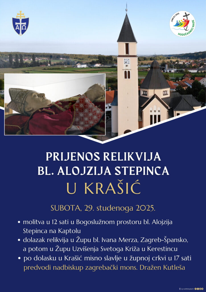 Ispraćaj relikvija bl. Alojzija Stepinca iz Bogoslužnog prostora bl. Alojzija Stepinca na zagrebačkom Kaptolu započet će u subotu 29. studenoga molitvom u 12 sati, izvijestio je Tiskovni ured Zagrebačke nadbiskupije.