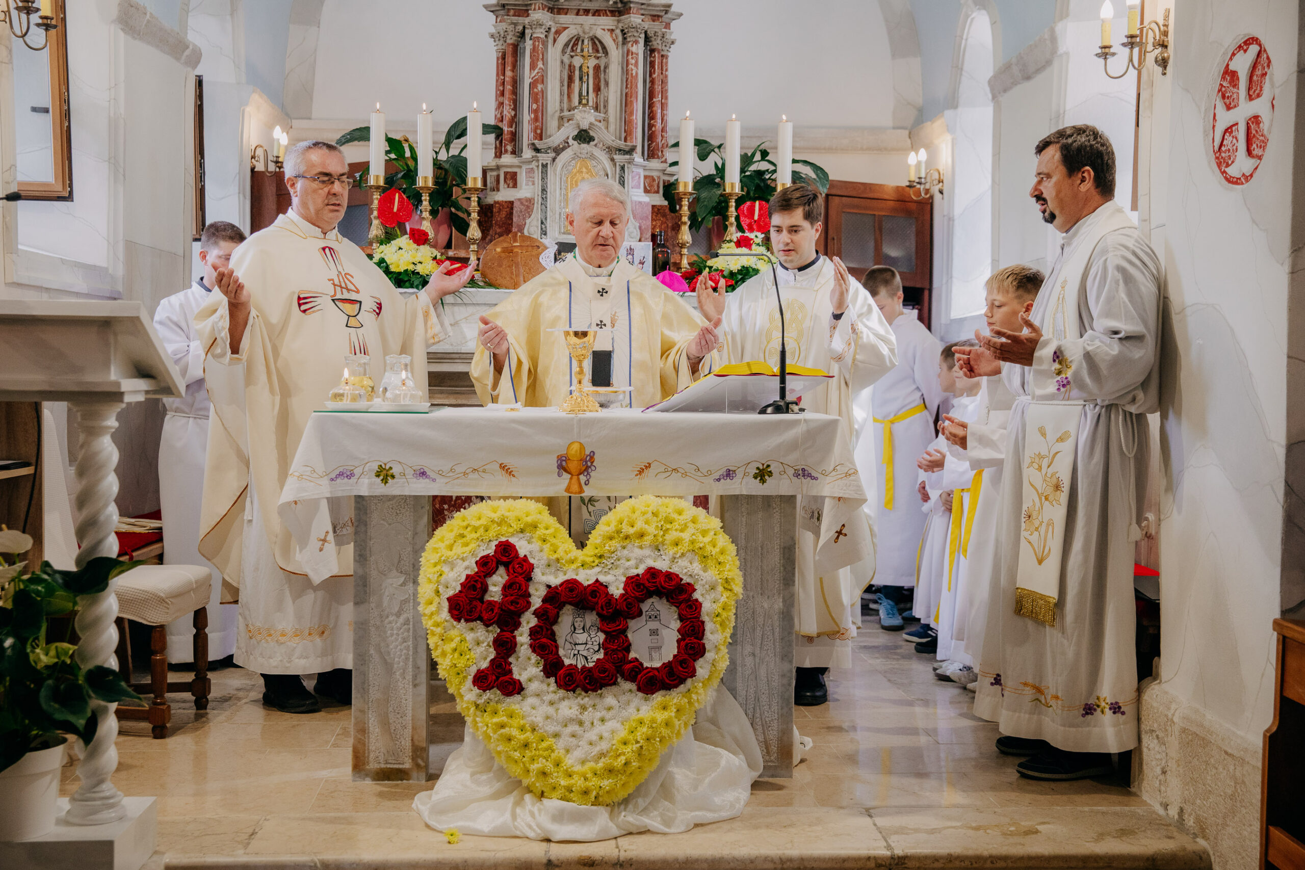 Misu su koncelebrirali mjesni župnik don Stipan Bodrožić, svećenik rodom iz Podgrađa don Mato Škaričić te nadbiskupov tajnik don Robert Pudar. Liturgijsko pjevanje predvodio je župni zbor Župe Uznesenja BDM, a i ostali su župljani sudjelovali čitanjem misnih čitanja, molitve vjernika te prinošenjem darova na oltar.