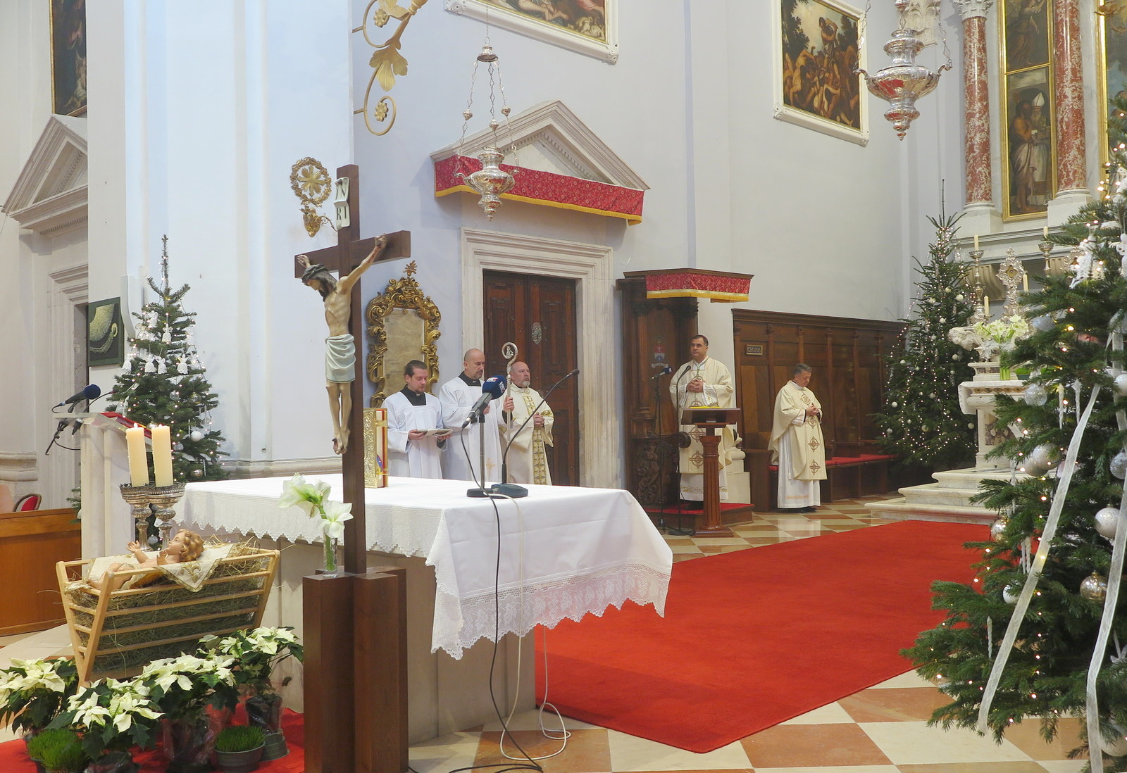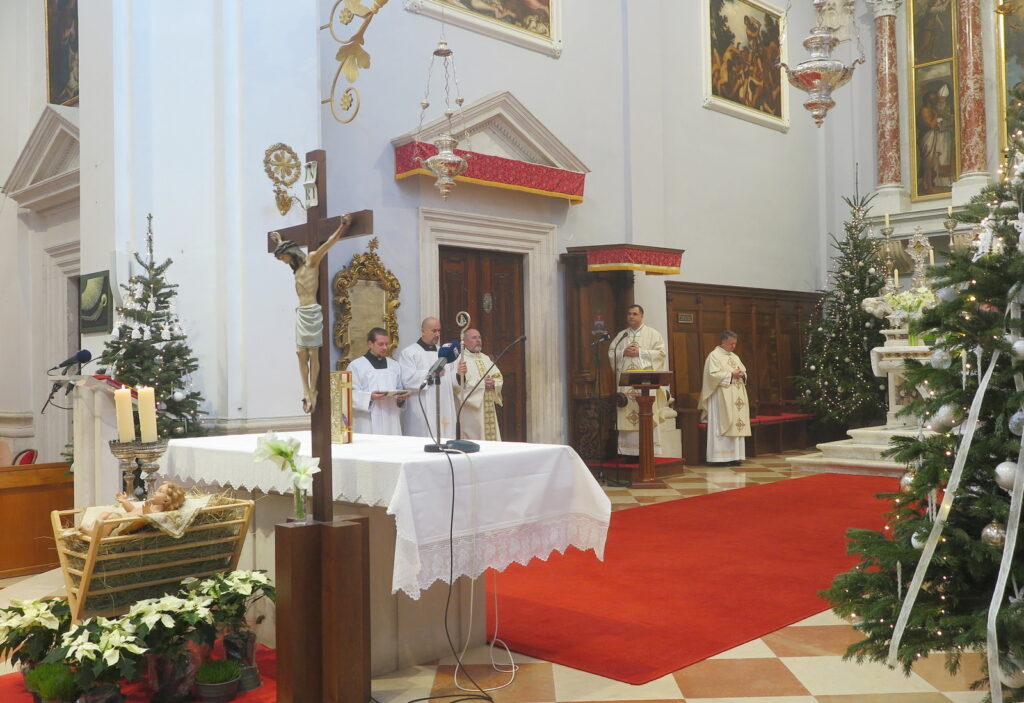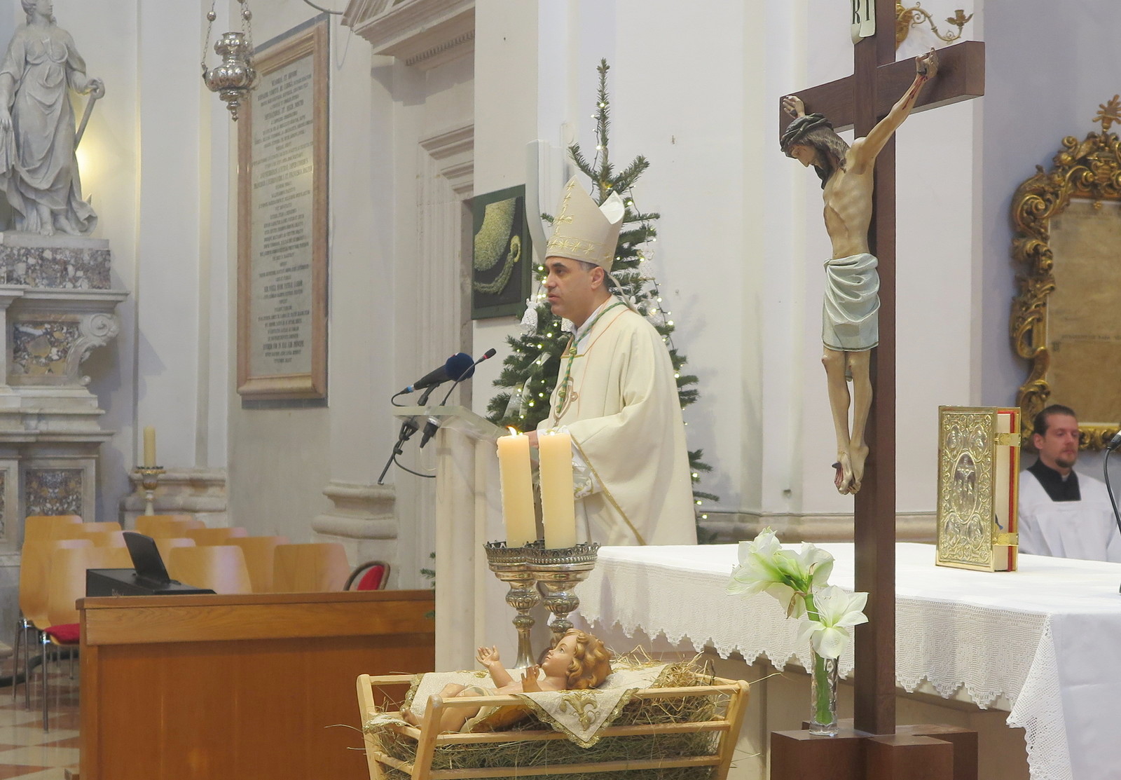 Suslavili su generalni vikar mons. Ivica Pervan, kustod Franjevačke kustodije sv. Jeronima – Zadar fra Tomislav Šanko i katedralni župnik don Marin Lučić uz asistenciju đakona don Tomislava Sikavice, dubrovačkih bogoslova i ministranata. U propovijedi je biskup govorio o otajstvu Božića „u kojem se susreću Božje utjelovljenje i čovjekovo pobožanstvenjenje jer Bog silazi k nama da bi nas uzdigao sebi“. Podsjetio je na naglaske misnih čitanja koja govore o tome kao i o „preokretu vrijednosti“ koje je Isus donio.