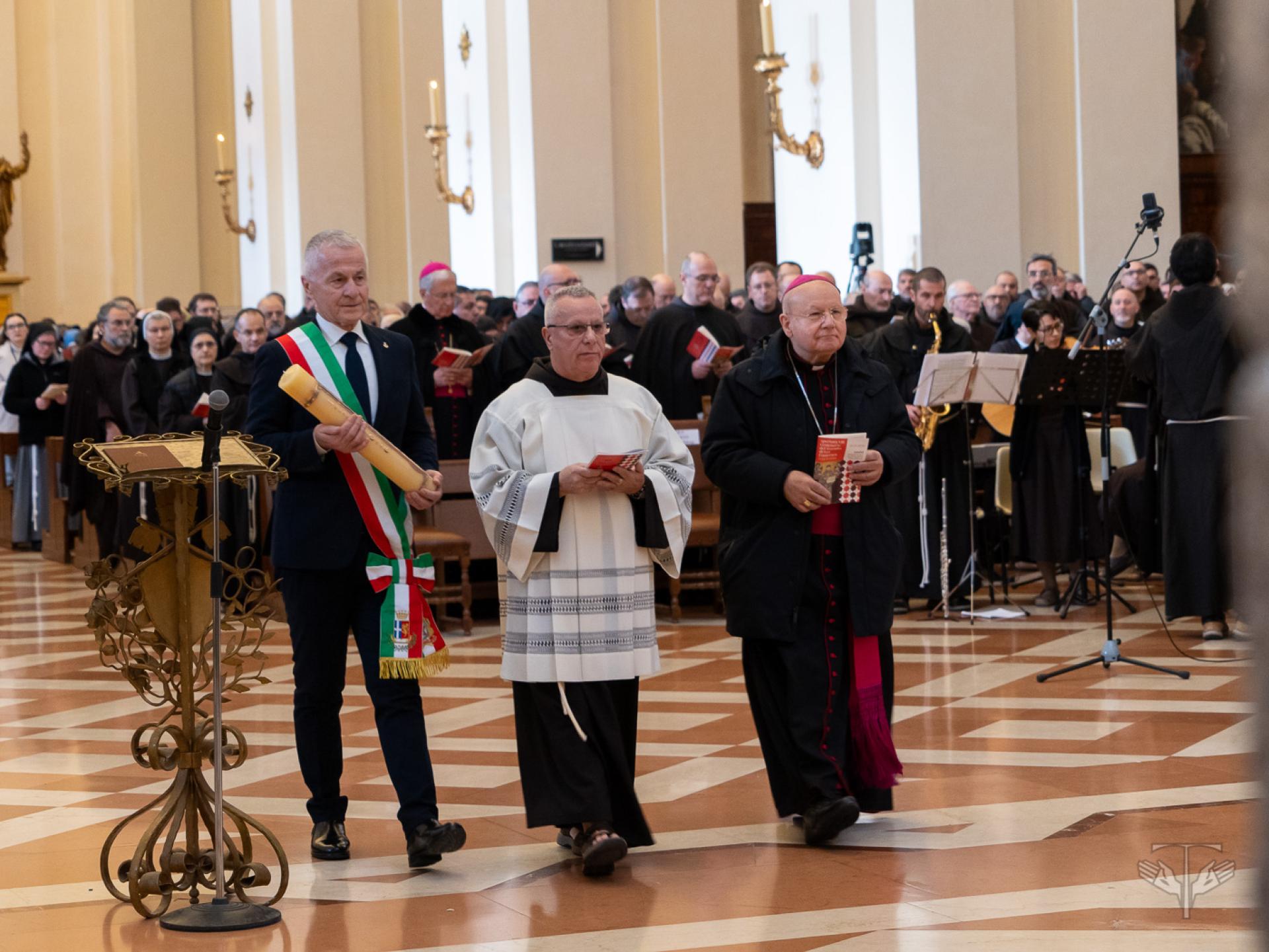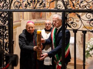 Obred otvaranja počeo je gestom zamišljenom kao simbolički i duhovni most između 800. obljetnice skladanja Pjesme stvorova (2025.) i obljetnice preminuća (2026.). Prisjećajući se posljednjih dviju strofa Pjesme, koje su posvećene pomirenju i sestri tjelesnoj smrti, u spomen na pomirenje između biskupa i gradonačelnika Asiza, biskup Asiza-Nocera Umbra-Gualdo Tadino i Foligna mons. Domenico Sorrentino i gradonačelnik Asiza Valter Stoppini ušli su u baziliku noseći neupaljenu svijeću, znak čovječanstva obilježenog sukobom i krhkošću.
