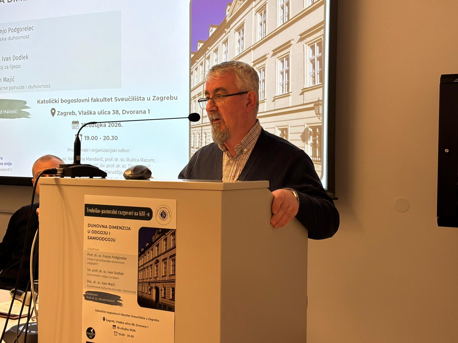 Prvo izlaganje održao je prof. dr. sc. Franjo Podgorelec na temu „Može li se kršćanska duhovnost odgajati?”. U svom izlaganju naglasio je da je duhovnost ponajprije dar milosti i dinamičan odnos s Kristom, koji prethodi svakom odgojnom nastojanju. Istaknuo je kako je u kršćanstvu ključno najprije slobodno prihvaćanje osobe Isusa Krista. Sadržaj vjere (fides quae) dolazi kao logična posljedica čina vjere (fides qua). Duhovni rast odvija se kroz proces suobličenja Kristu po Duhu Svetome, uz važnu ulogu zajednice i svjedočanstva vjernika. Zajednica je korektiv individualne duhovnosti i jamstvo autentične duhovnosti. Posebno je naglasio da samoodgoj proizlazi iz već primljenog dara te predstavlja odgovor na Božje djelovanje u čovjeku.