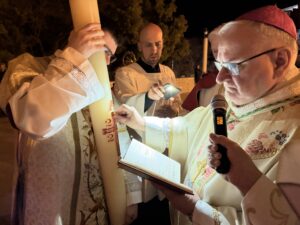 Zaključujući, citirao je svetoga Pavla i istaknuo da kršteni u Kristu hodaju u novosti života, jer Krist uskrišen od mrtvih više ne umire i smrt njime više ne gospoduje. „Večeras, na Uskrs, ponovno izabiremo Krista za svjetlo svojega života kako bi se i na nama ostvarila Božja obećanja, kako bismo doista bili njegovi svjedoci u ovome svijetu i baštinici uskrsne pobjede koja nema kraja“, zaključio je biskup Rogić.