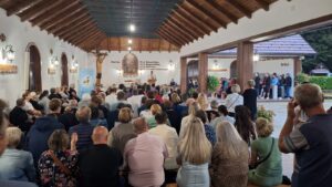 U poluotvorenom liturgijskom prostoru svetišta počela je pobožnost molitvom krunice i litanija upućenih Bogu Ocu, uslijedila je misa koju je predslavio upravitelj svetišta vlč. Ivan Živić, gunjanski župnik.