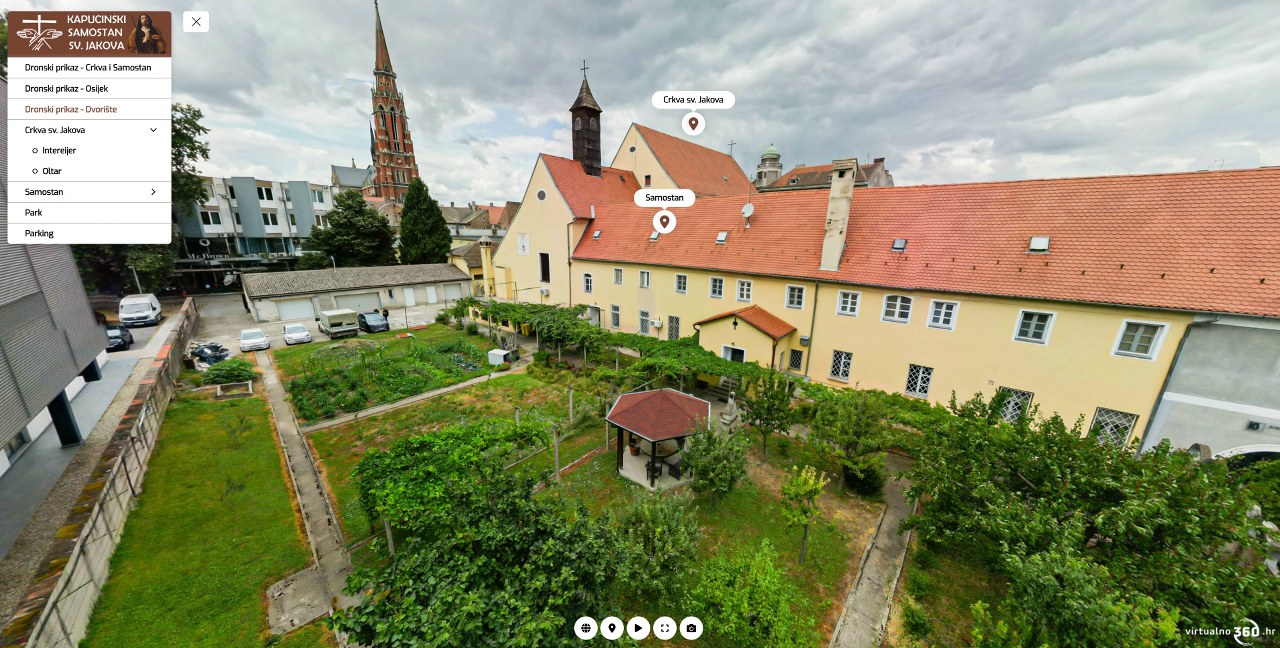 Uz detaljni prikaz, crkvu i osječki kapucinski samostan može se vidjeti i dronski, kao i dvorište, parkiralište te park oko samostana u Prolazu Vanje Radauša. Dostupan je i dronski prikaz samog središta Osijeka. Interaktivne točke za prikaz obuhvaćaju i interijer crkve sv. Jakova, oltarni prostor crkve, kao i kapelu unutar crkve i sakristiju. Cijela virtualna šetnja može se pogledati i autorotacijom.