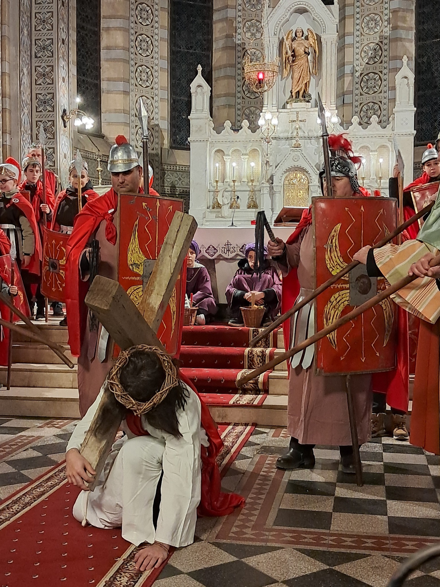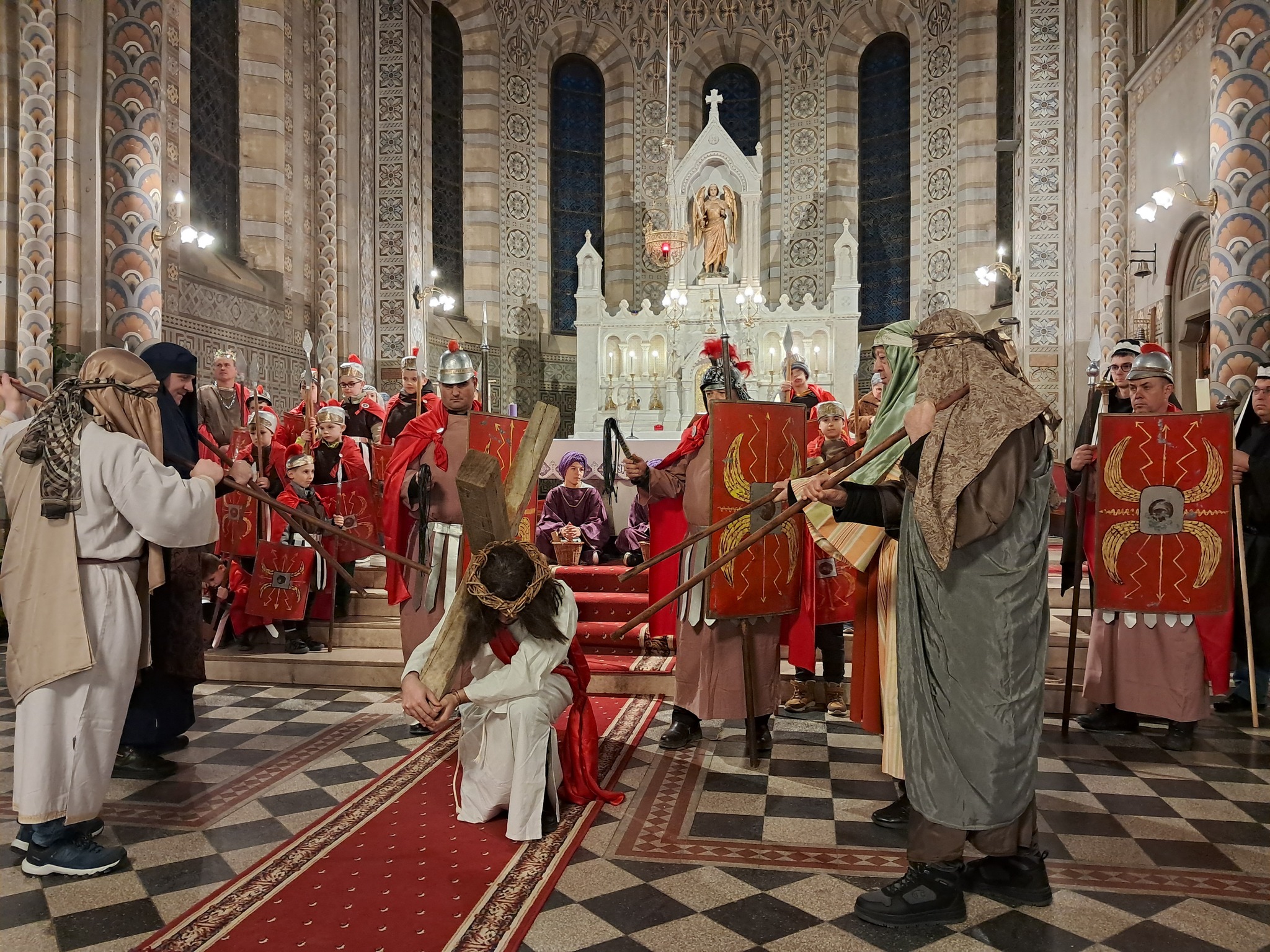 Dok molitelj predvodi pobožnost, glumci, odjeveni u odgovarajuće kostime, u tišini uprizoruju pojedine postaje, kako bi vjernici mogli neposredno doživjeti događaje Isusova križnog puta do Kalvarije.
